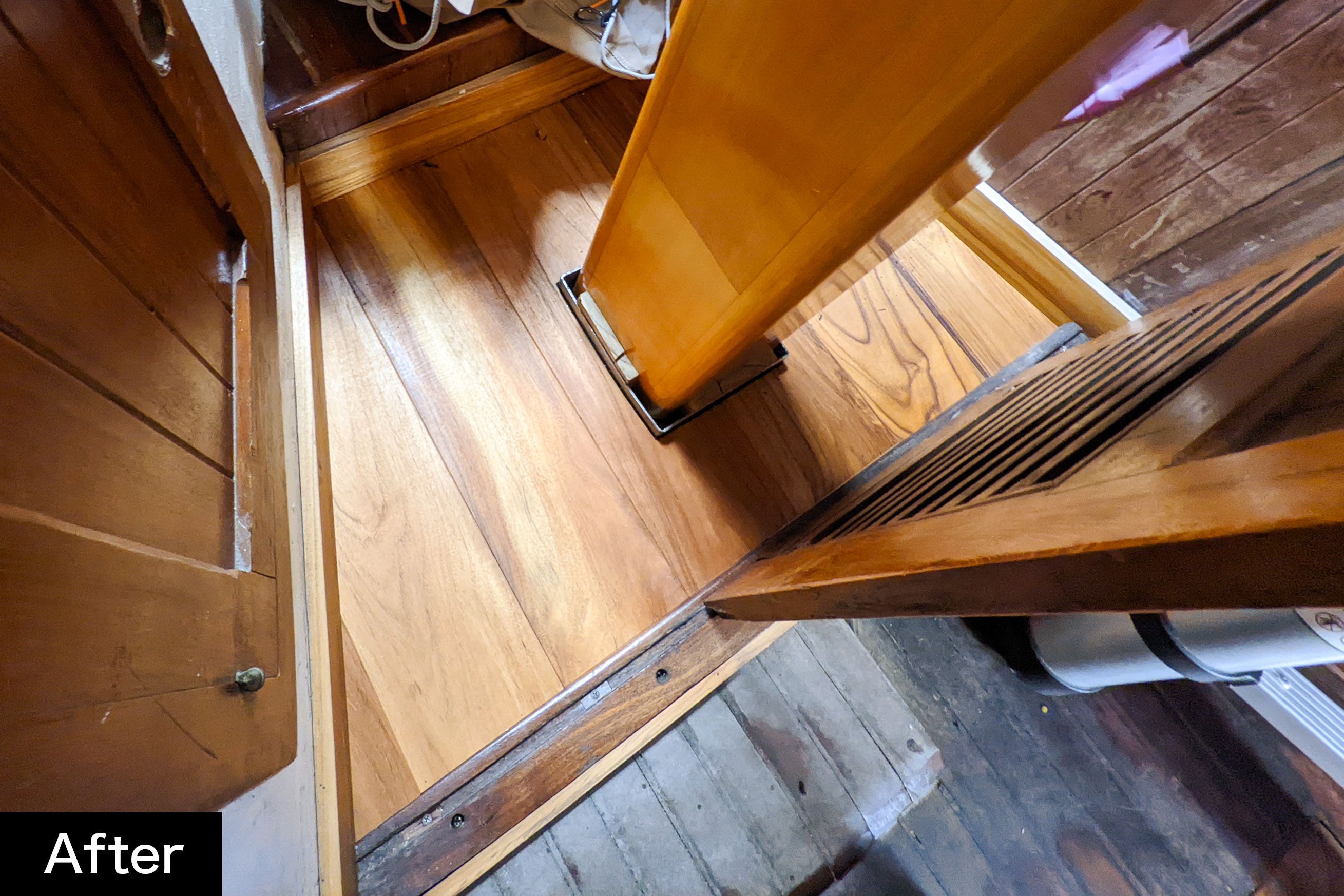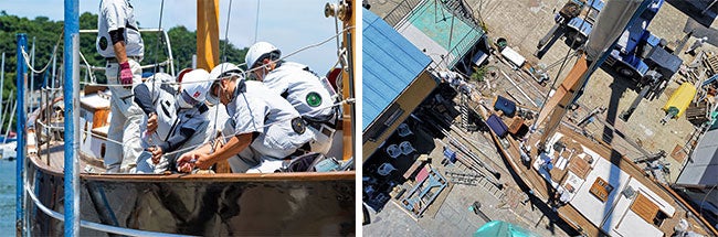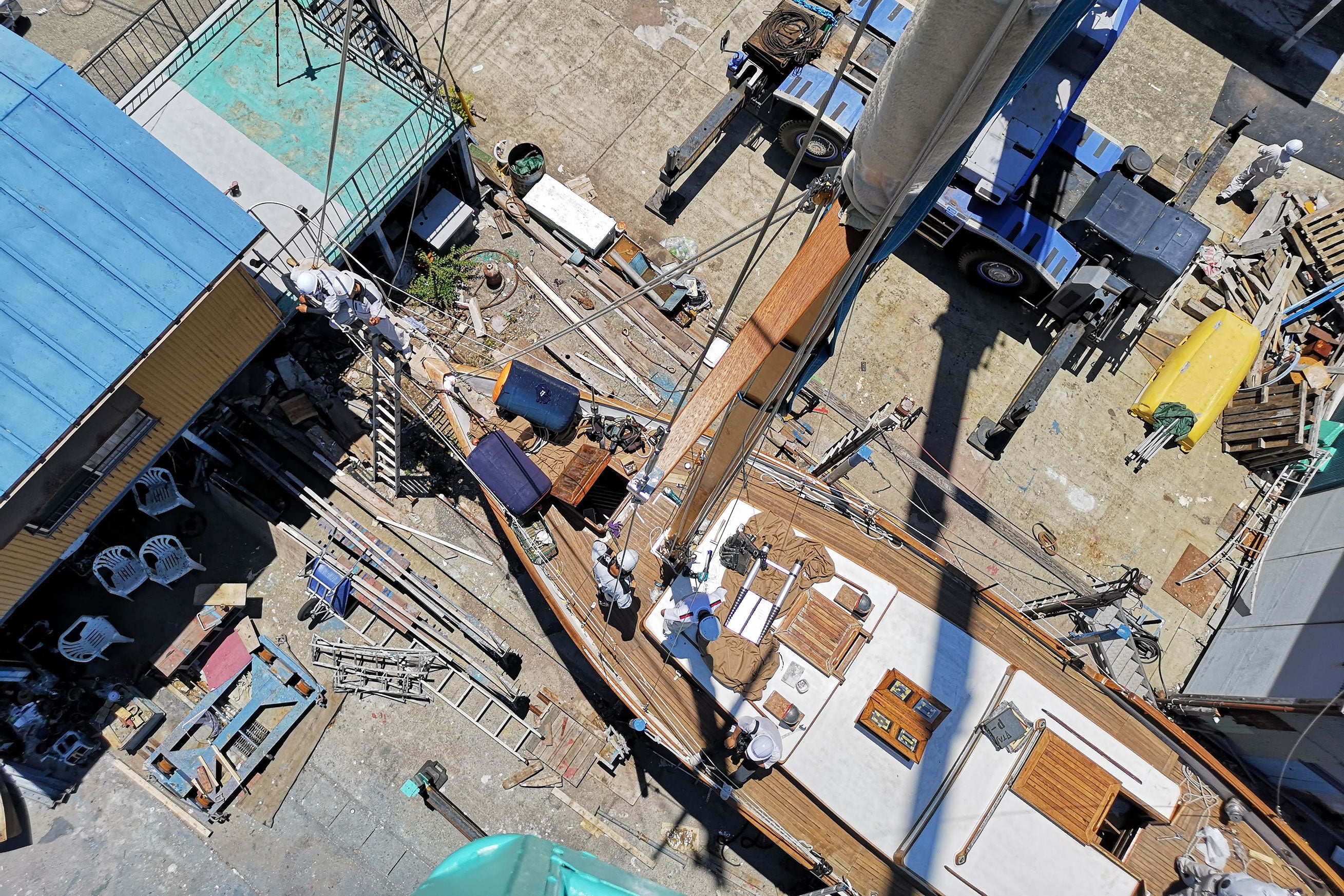 クレオパトラ号は二本のマストを持つケッチ型と呼ばれ、海外ではクラシックヨットとしても人気が高いが、日本では珍しい帆船。レストアするためには様々な知識や技術が必要とされていたものの、現存する木造帆船の減少、木部の修繕の担い手である技術者の不足も相まって、水や風の抵抗を考慮した曲面を用いた木工技術は失われつつある。さらに16m以上の主要木部の修繕を伴う、大規模レストアを受け入れ可能な技術集団は限られてきている。そんな中、木部と金物のレストアを「建築工程の内製化」を掲げる建築会社の現代大工たちが引き受けた。構造から内装や家具、防水シーリングまで狭い空間での作業でありながら、プロのマリン業者と連携してレストアを実施。自然と広がる人脈により専門業者と他業者が交錯し、エレガンスをテーマとしたクルーザーとして現代へと蘇らせた。