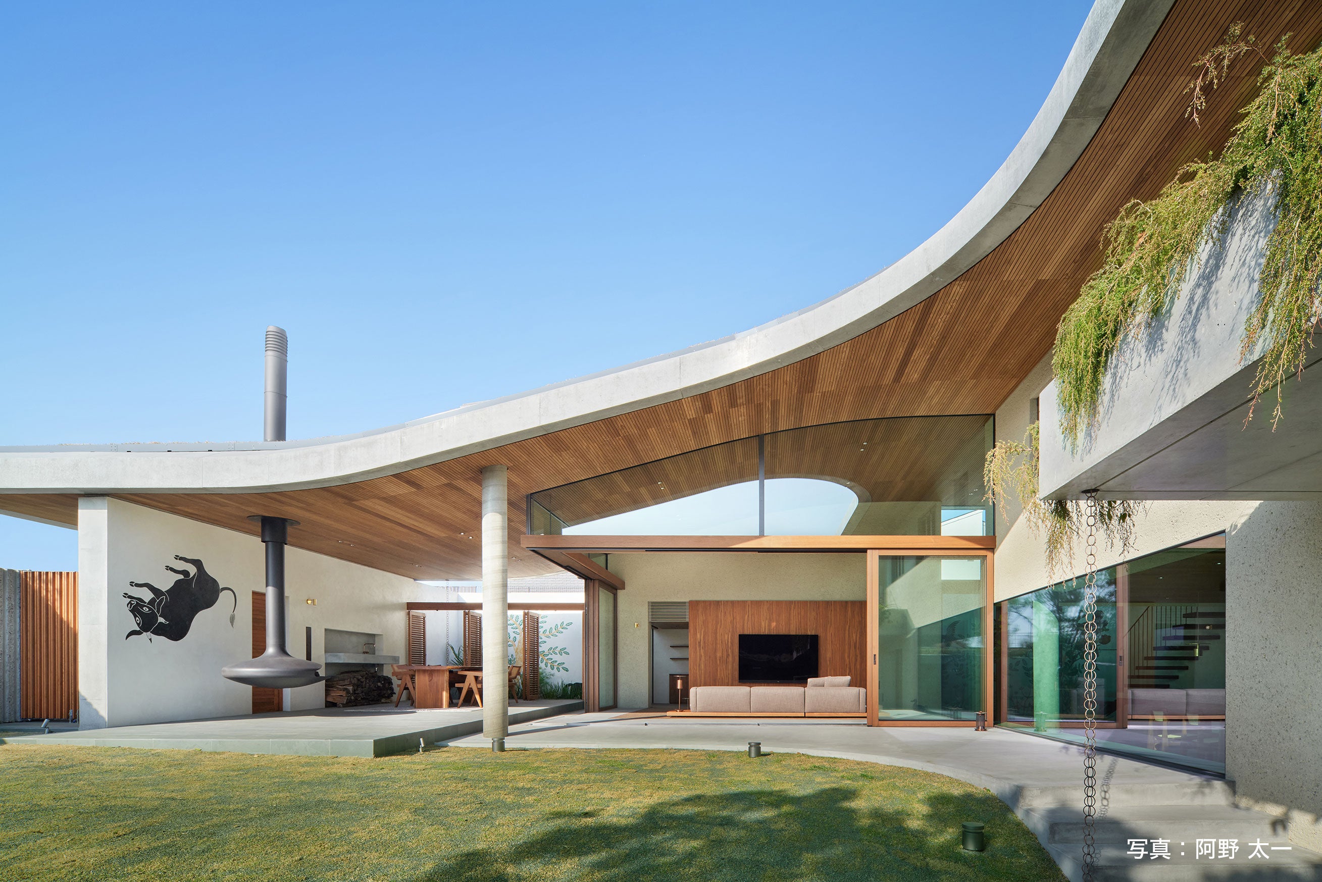 非常にのびやかな住宅である。屋上緑化された屋根と庭の樹木が、緑の少ない周辺環境に潤いを与えている。丘のような屋根と緑がプライバシーを守り、塀を作らずに町と住宅を繋げているのも良い。丘のような屋根は犬と人間が共存するプラットフォームにもなっているようだ。屋根の下では外部空間と内部空間がシームレスに繋がる。外部のような開放的な内部空間と、内部のような落ち着きのある外部空間が相乗して気持ち良さそうな住まいである。内部空間も自然素材を多用しながら丁寧にデザインされているのが窺える。