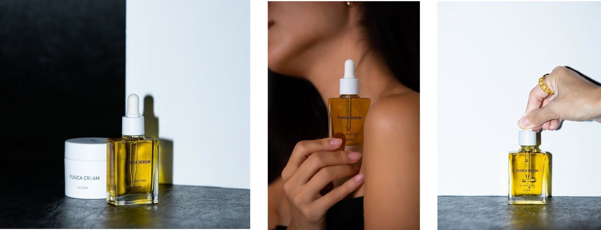 浸透を加速化させるブースター美容液として「FUSICA SERUM」、保湿・エイジングサイン(乾燥によるくすみ・カサつき・ハリ不足)対策として「FUSICA CREAM」を使用することで、W効果を図ることができます。