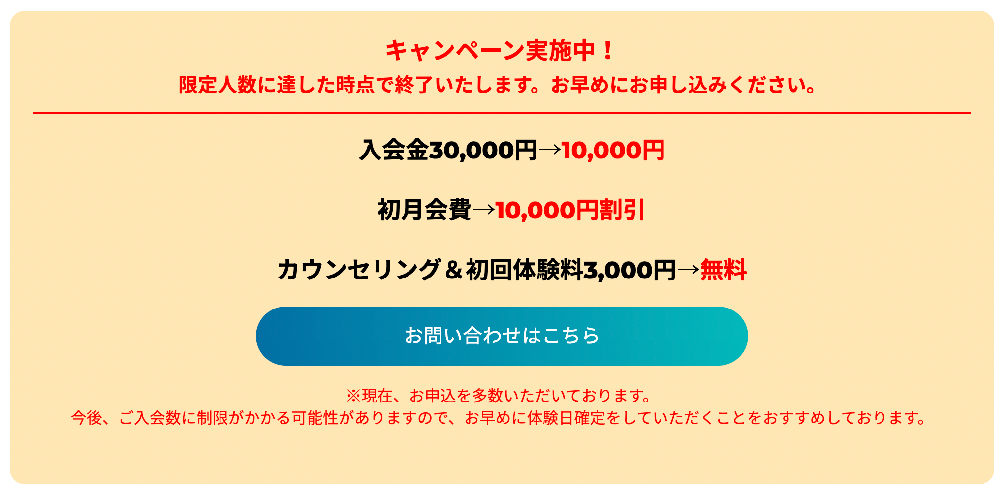 限定人数に達した時点でキャンペーンは終了いたしますので、ご入会をご検討中の方はお早めにお問い合わせください。