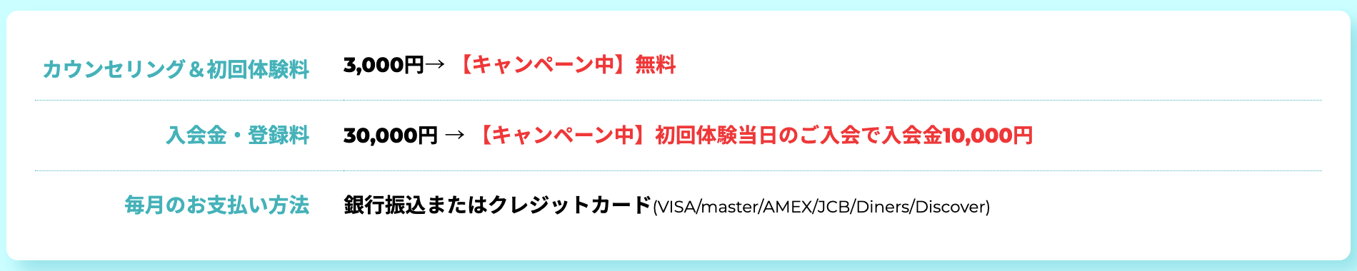 新店舗リリースを記念に、初回体験料無料、入会金2万円オフ、初月会費1万円オフの期間限定キャンペーンを実施中です。