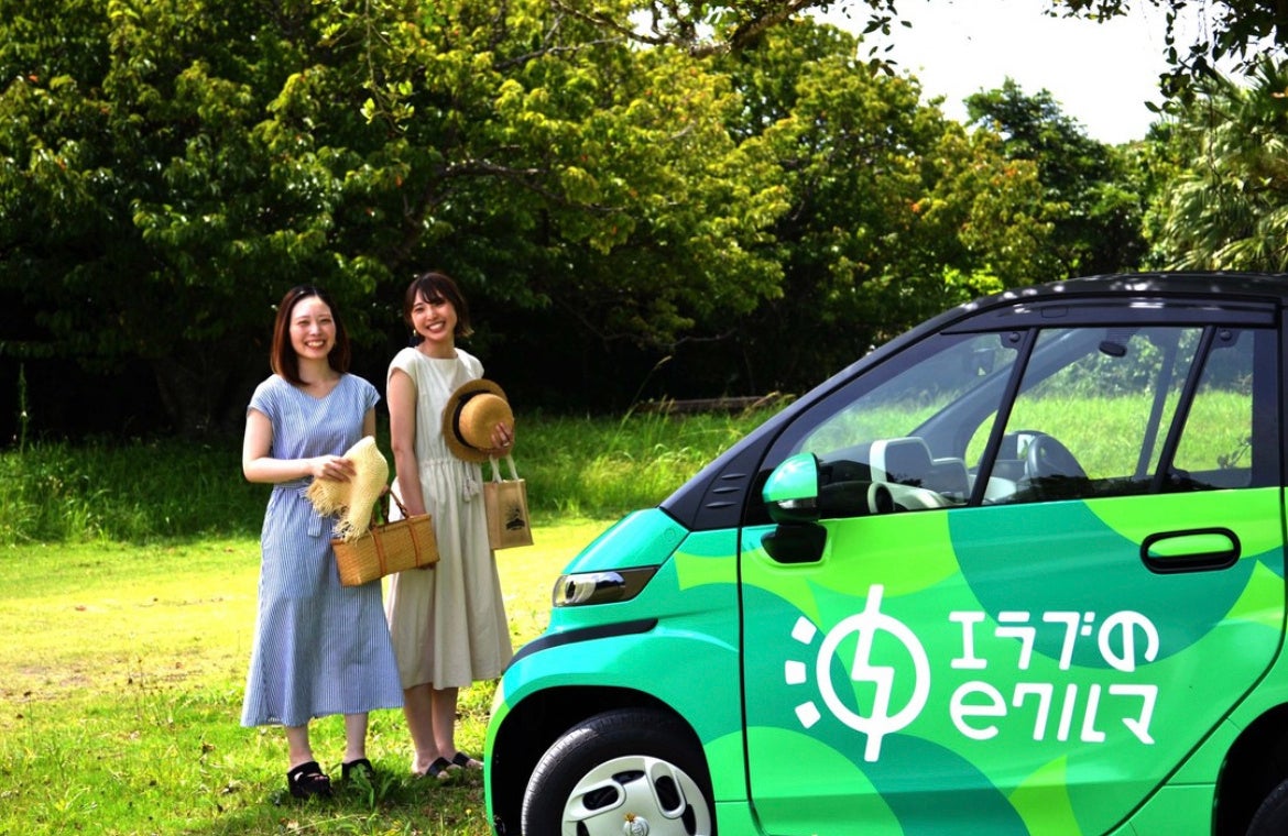 「ゼロカーボンアイランドの宣伝カー、『エラブのeクルマ』がレンタルサービス開始! おきのえらぶ島にご滞在中にはぜひご利用いただきたい超小型EVモビリティのレンタルサービスがスタートしました。『エラブのeクルマ』と名付けられたこちらの車両は、TOYOTA C+podを起用し、平日は公用車として、土日祝日は観光客の皆さんや島の皆さん方向けのちょい乗り用レンタカーとしてご利用いただけます。お持ちのスマートフォンが鍵の代わりとなりますので、ご来島前には専用アプリ「トヨタシェア」をインストールし、事前登録を済ませておいてくださいね。沖永良部島は奄美群島国立公園にも指定された手つかずで豊かな自然が残る島。そんな島の美しい自然と優しく調和するようなクルマに! というコンセプトで、様々なトーンのグリーンのサークル模様が重なり合ったデザインとなりました」