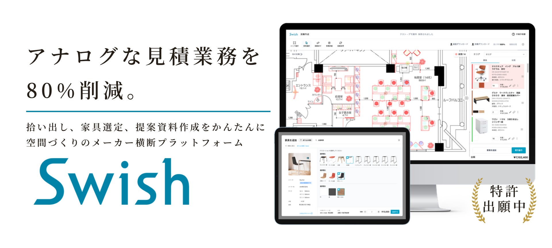 株式会社Swishは、「空間づくりの常識をアップデートする。」をミッションに掲げ、大手オフィス家具メーカーのコクヨ株式会社出身の代表が2021年7月に設立した会社です。様々な環境変化によって需要が高まるオフィスの空間づくりにおいて、見積業務のアナログさによって引き起こされる納品ミスや長時間労働、また受注機会の損失をなくす業務効率化サービス「Swish」を開発・提供しています。