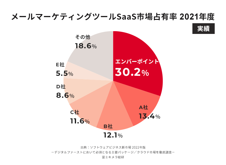 エンバーポイント株式会社(本社:東京都千代田区、代表取締役社長:神谷 勇樹、以下エンバーポイント)は、株式会社富士キメラ総研(本社:東京都中央区、代表取締役社長:田中 一志)が2022年7月22日に発行した市場調査レポート「ソフトウェアビジネス新市場 2022年版-デジタルファーストにおいて必須となる主要パッケージ/クラウド市場を徹底調査-」において、エンバーポイントが開発・提供するメール配信システム「Mail Publisher」がメールマーケティングツールSaaS市場の売上金額占有率No.1(2021年度)を獲得したことを本日発表いたしました。
