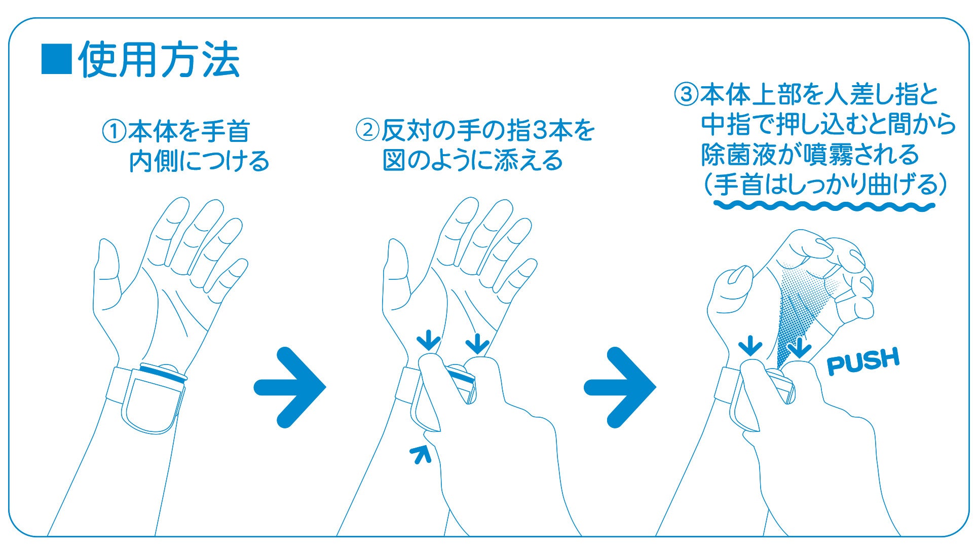 市販のアルコール等の除菌液の入ったタンクを手首に装着し、いつでもどこでも思い立った瞬間すぐに除菌液を手のひらに噴霧できるという製品です。【特許出願中:出願番号2020-98918】