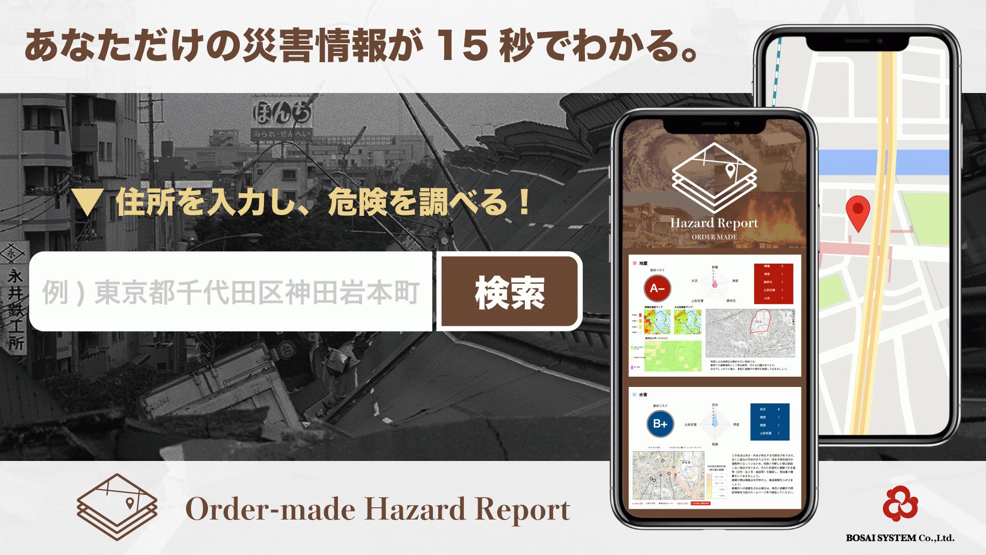 - 導入店舗の抱えるお客様(個人・法人)は「①災害に対する正しい危機意識を持つ」「②災害種別危険度を知る」「③必要備蓄を知る」「④備蓄を一括購入できる」ことが一気通貫でできます。②で取得するハザードレポートは発行部数がバックグラウンドで計測され、導入店舗が地域の防災力向上にどれだけ貢献したかを数値により可視化します。