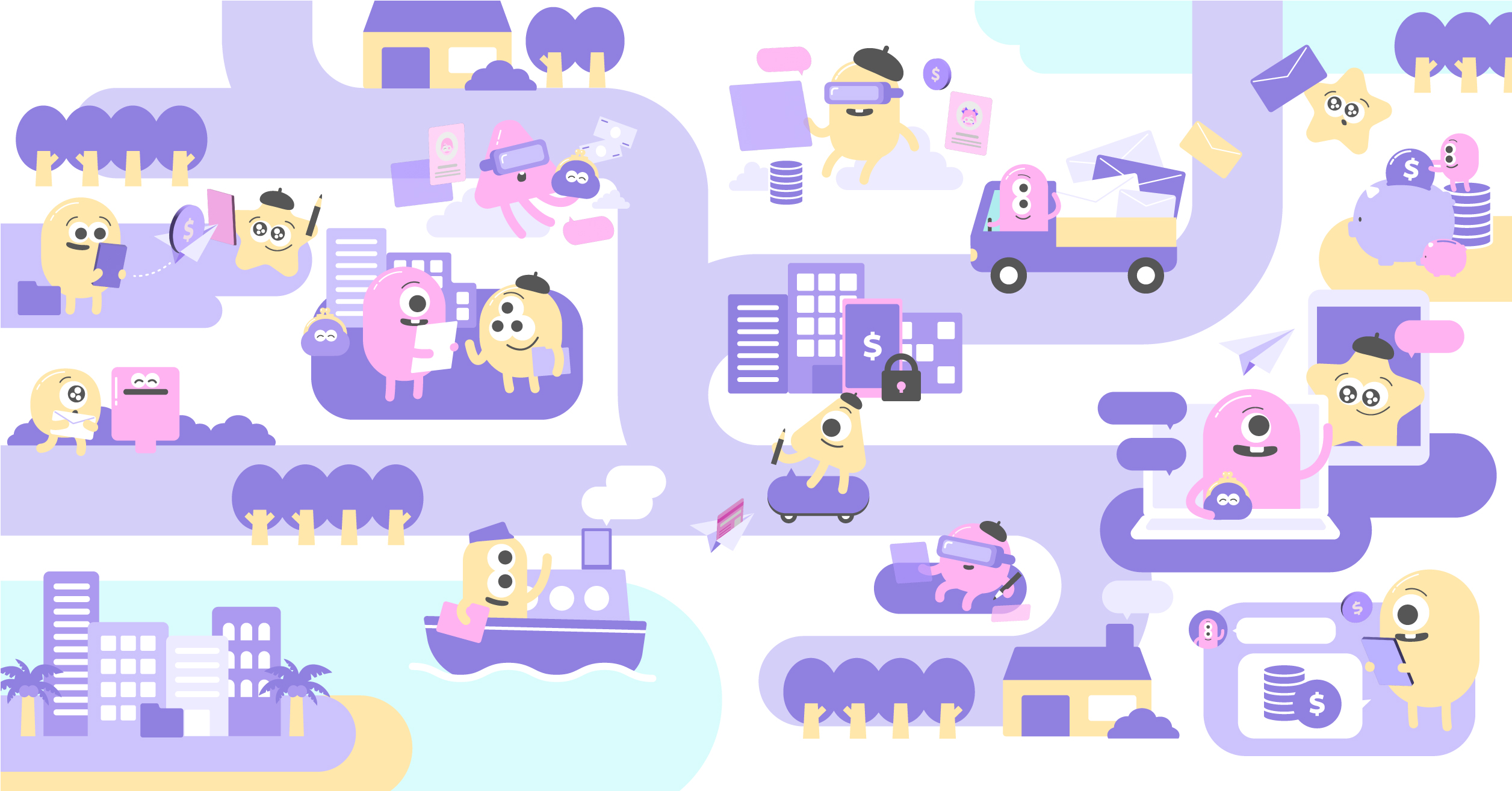 イラストの中ではモンスターたちが対面・オンライン・メタバース空間(VRゴーグル)を使用しながらクライアントとやりとりを行っており、通貨も日本円や外貨の法定通貨やトークンを活用しながら取引を行っています。