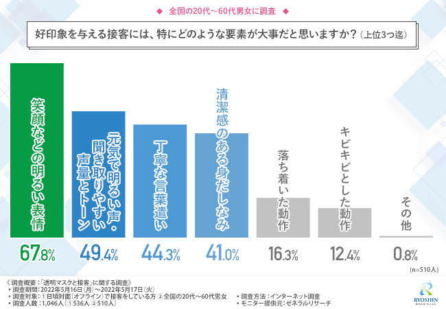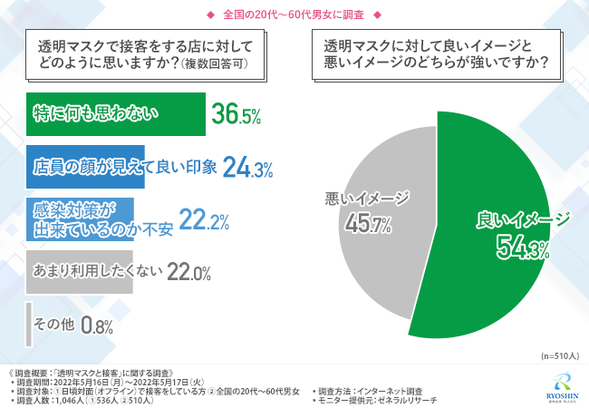 菱神産業株式会社(本社所在地:兵庫県加古川市、代表取締役:上野 勇次)は、①日頃対面(オフライン)で接客をしている方②全国の20代〜60代男女を対象に「透明マスクと接客」に関する調査を実施しました。