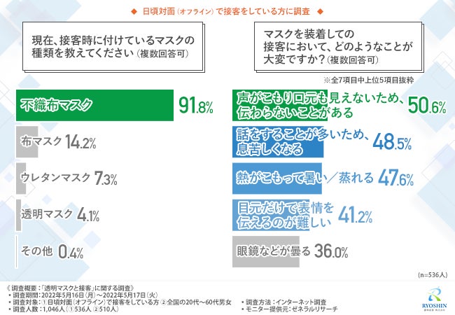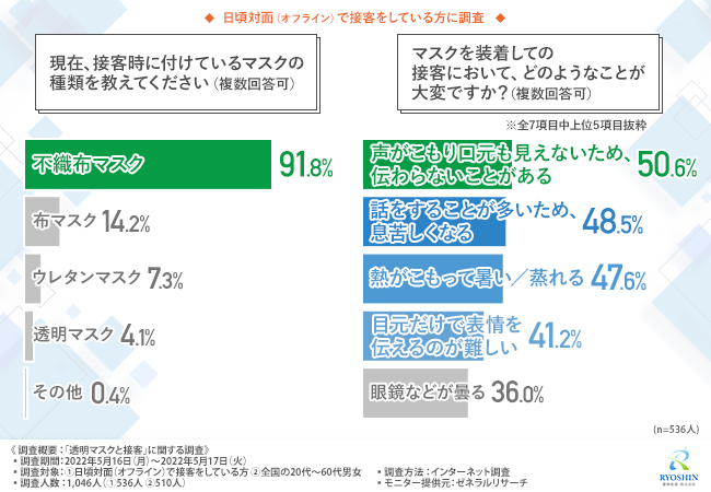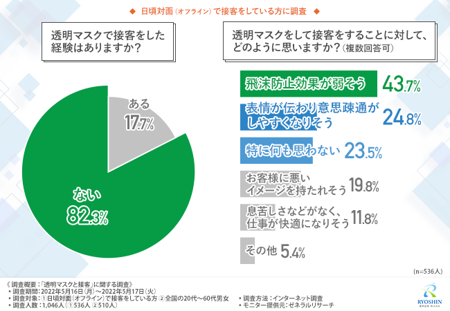 そこで今回、透明マスク『マスクリア』(https://www.ryoshin.com/service/masclear/)を販売する菱神産業株式会社(https://www.ryoshin.com)は、①日頃対面(オフライン)で接客をしている方②全国の20代~60代男女を対象に「透明マスクと接客」に関する調査を実施しました。
