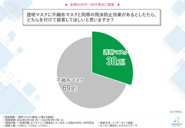 そこで、「透明マスクに不織布マスクと同等の飛沫防止効果があるとしたら、どちらを付けて接客してほしいと思いますか?」と質問したところ、3割が『透明マスク(30.2%)』と回答しました。