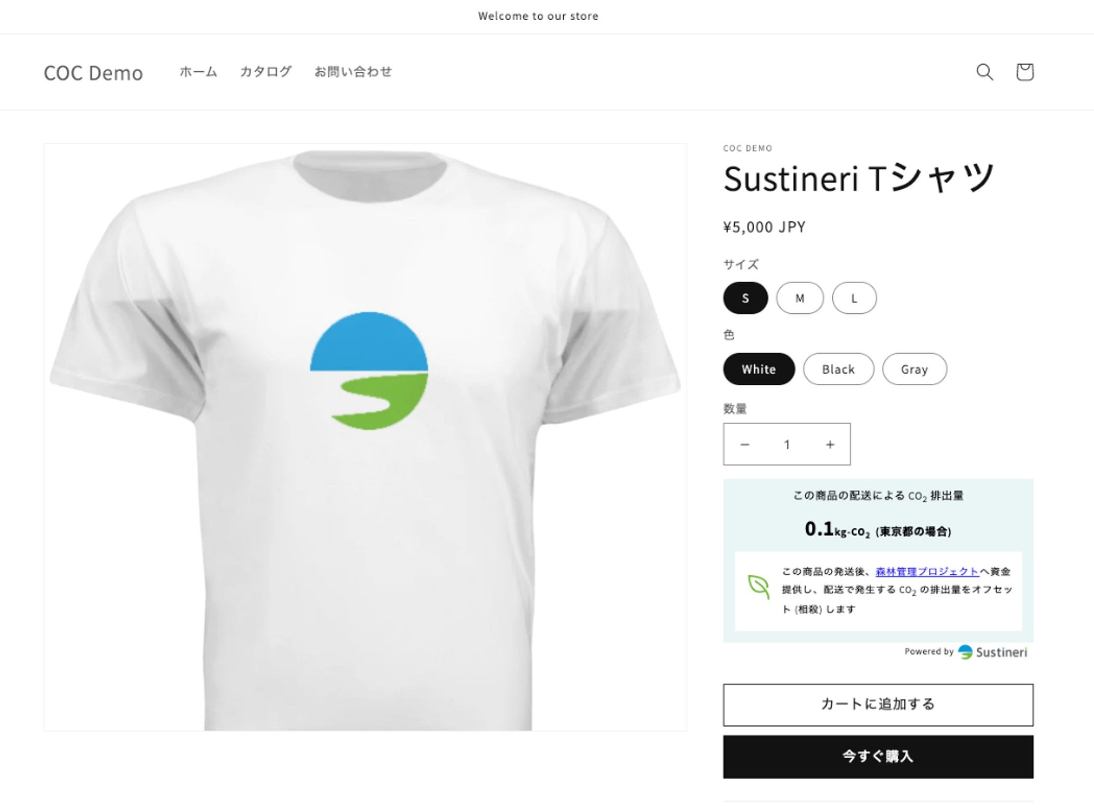 本アプリが提供するアプリブロックを商品ページに配置すると、商品の重量と配送距離に基づきCO2排出量が自動で算定、表示されます。