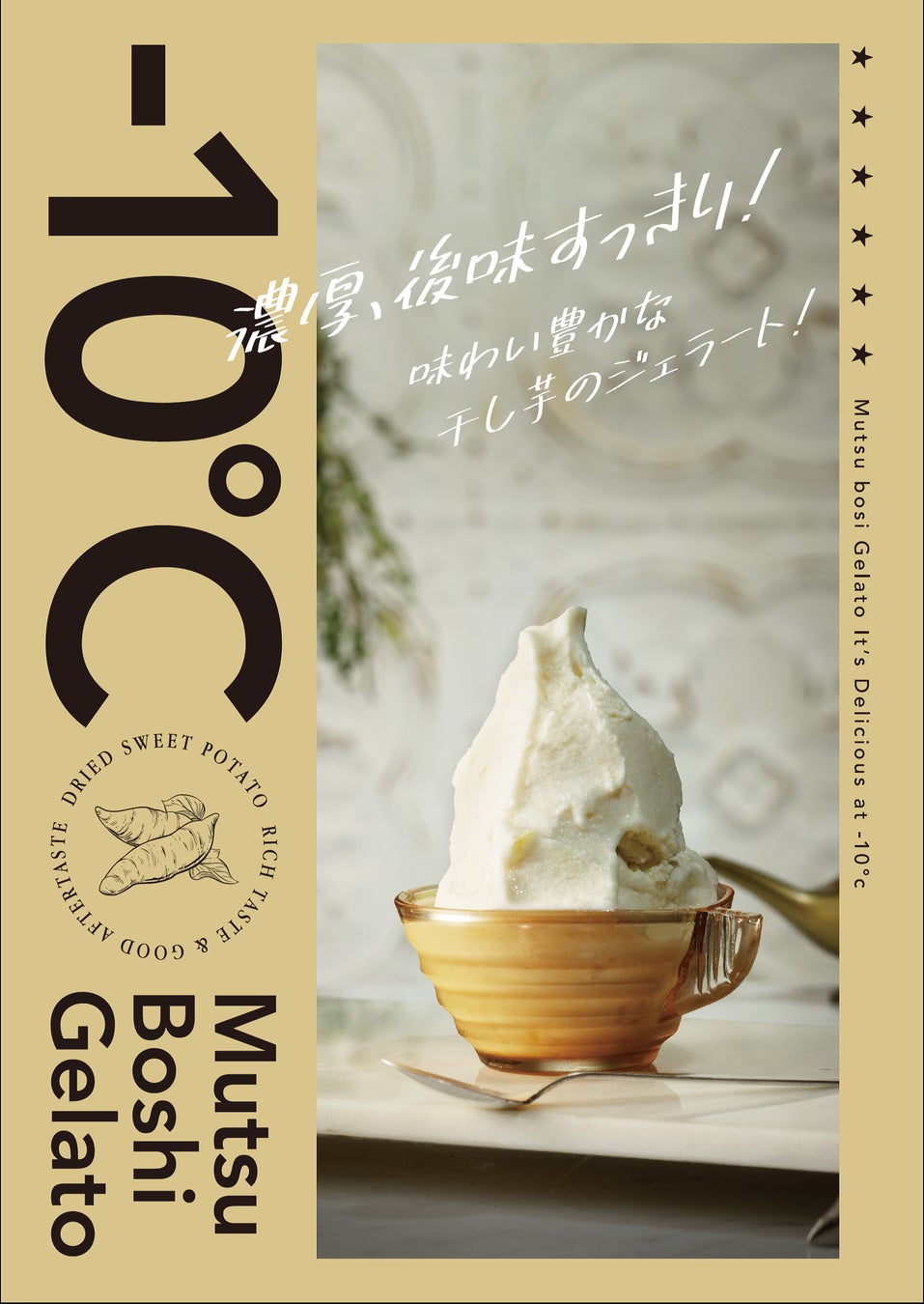 睦沢町等で栽培された甘みの強いさつまいも「紅はるか」は、天然ガスで蒸し上げることで一気に糖度が上がり、しっとりとした上品な味わいの干しいもができあがります。今回販売を開始した「-10℃ Mutsu Boshi Gelato」では、干しいもの生産時に発生する加工残渣を加工し、干しいもの粒まで混ぜ込んだ、非常に手の込んだプレミアムジェラートです。最適な原材料配合比とオーバーラン(空気含有率)を徹底的に追求し、風味豊かで濃厚な味わいを実現しました。商品名にもなっている「-10℃ =ジェラートが最も美味しく感じられる最適な温度」でぜひお召し上がりください。