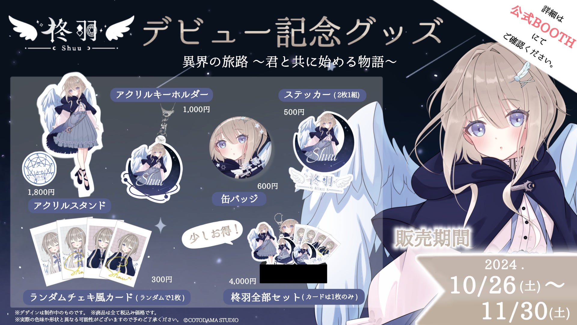 デビュー記念グッズ販売も行われます。デビュー記念として、「Welcome Goods」の販売を2024年10月26日(土)21時05分からCOTODAMA STUDIOオフィシャルストアにて行います。販売アイテムは缶バッジ、ステッカー、アクリルキーホルダー、アクリルスタンド、ランダムチェキ風カード、全部セットです。詳細については記事後半をご覧ください。
