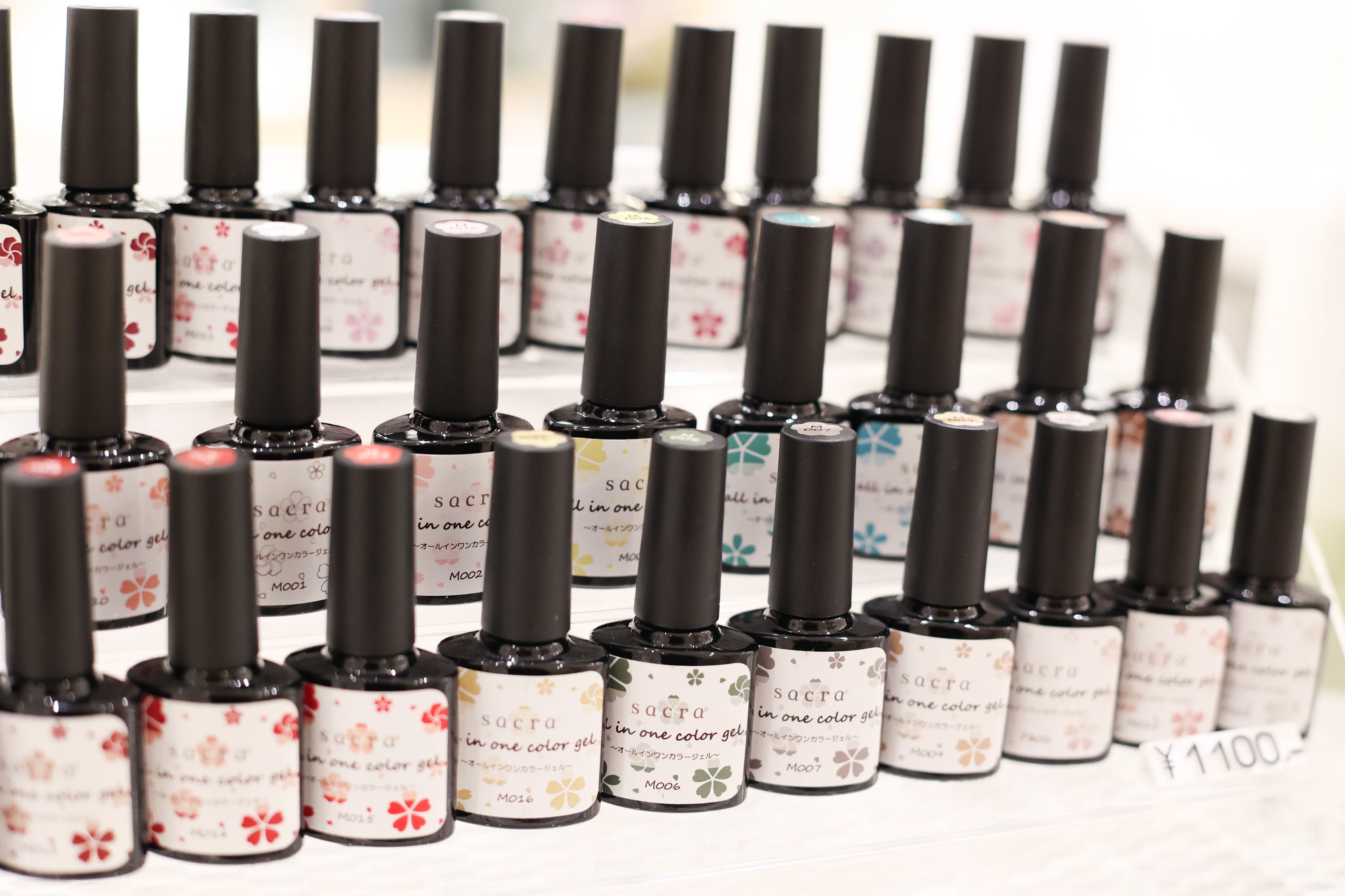 使用したジェルポリッシュは自宅でも使えるよう、1本¥1100で販売しております。