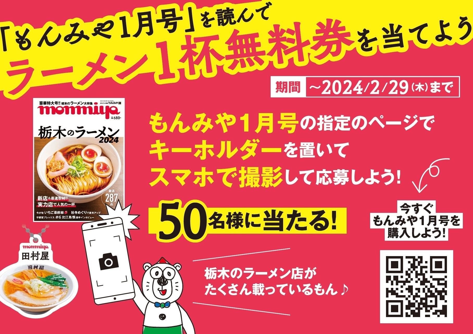 ラーメンキーホルダーと「もんみや1月号」を購入すると応募できるプレゼントキャンペーンを開催!