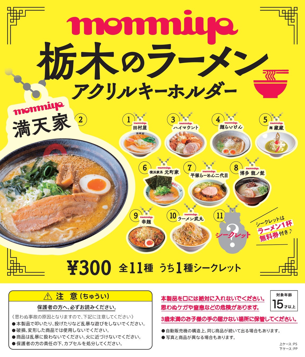 もんみや1月号「栃木のラーメン2024特集」に掲載しているラーメン店の中から、もんみや編集部がセレクトした人気ラーメン店10店舗のラーメンがキーホルダーに!各店のラーメンの写真と店名が印字されたアクリルキーホルダーです。もんみや1月号「栃木のラーメン2024」の連動企画として制作しました。キーホルダーのラーメン店は「満天家」「幸麺」「ラーメン武丸」「ハイマウント」など、県内で人気の10店舗です。シークレットのキーホルダーには、キーホルダーになったラーメン店で使える『ラーメン1杯無料券』が付いています。