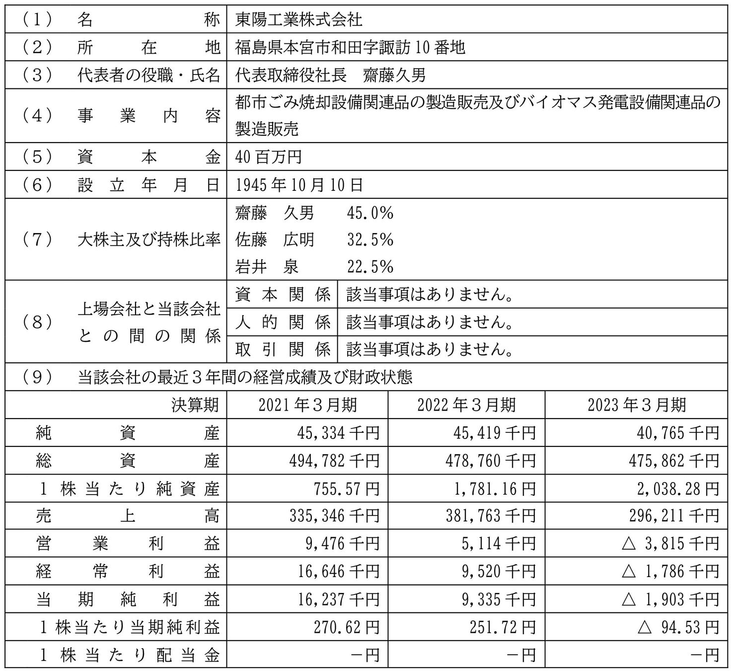 株式会社JRC(本社:大阪市西区、代表取締役社長:浜口稔、以下、当社)は、2023年12月28日開催の取締役会において、下記のとおり、当社の連結子会社であるJRC C&M株式会社(本社:兵庫県小野市、代表取締役社長:浜口稔、以下、JRC C&M)が、東陽工業株式会社(本社:福島県本宮市、代表取締役社長:齋藤久男、以下、東陽工業)の全株式を取得し子会社化することを決議いたしましたので、お知らせいたします。なお、東陽工業は、資本金の額が当社の資本金の額の100分の10以上に相当するため、当社の特定子会社に該当することとなります。