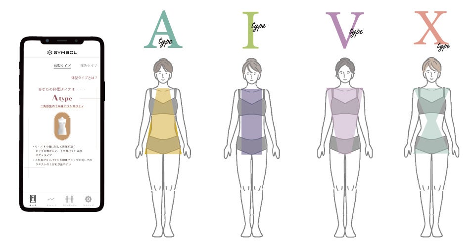 正面からみた形をアルファベットの「V」「I」「X」「A」の形に合わせて4タイプに診断、サイドからの測定で身体の厚みを上半身と下半身で3タイプずつに分けて診断、これらを組み合わせた計36通り(男女計72通り)の中から体型タイプを診断します。