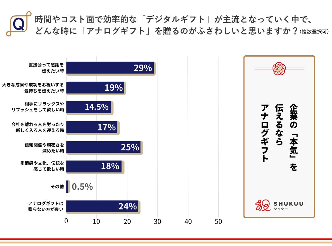 ・アナログギフトの価値:「直接会って感謝を伝える機会の創出」(29%)や「信頼関係や親密さの深化」(25%)に効果的と評価