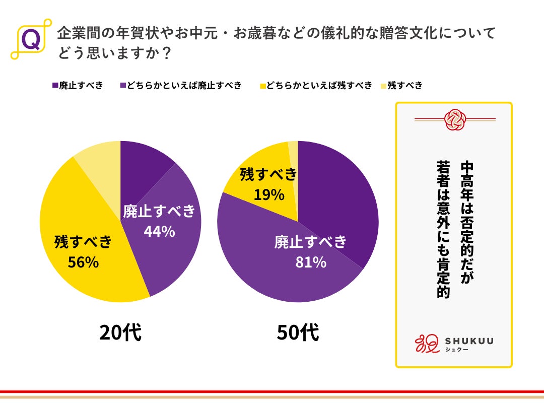 一方で、現役デジタル世代の20代は「残すべき」が56%、「廃止すべき」が44%と、アナログな贈答文化を継承したいという考えが過半数を超え、81%が「廃止すべき」と回答した50代とは対照的な結果となりました。