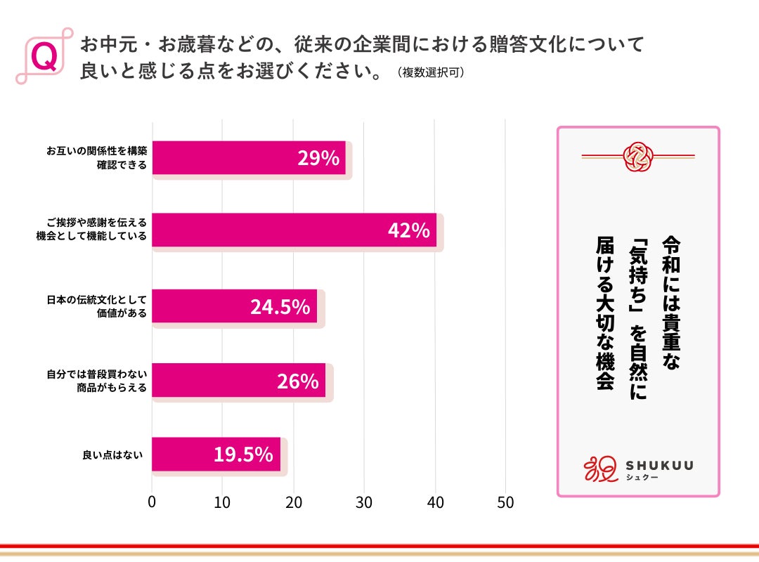 従来の贈答文化の良い点として最も多かったのは「ご挨拶や感謝を伝える機会」(42%)となり、次いで「関係性を構築、確認できる」(29%)という結果に。これは人間関係が希薄な現代において、贈答文化がビジネスコミュニケーションの貴重な要素として認識されていることを示しているのではないでしょうか。
