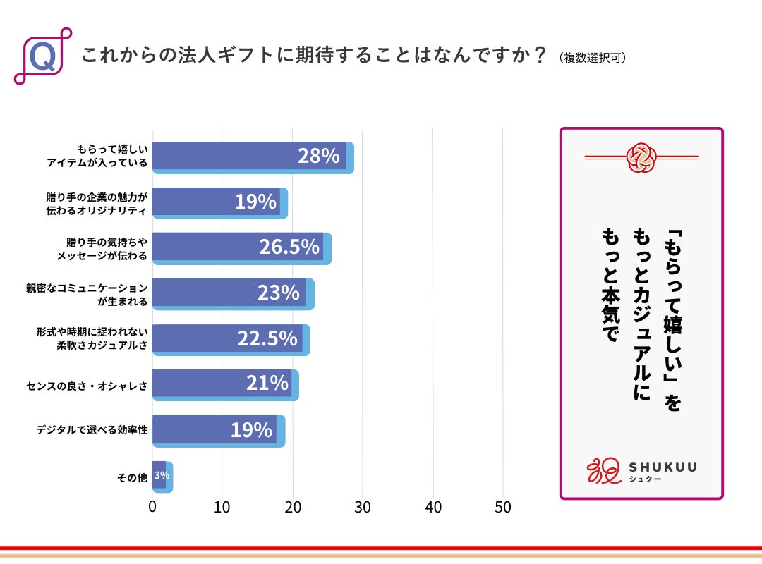 ・今後の企業ギフトへの期待:「もらって嬉しいアイテム」(28%)、「送り手の気持ちが伝わる」(26.5%)など、実用的で効果的なギフトに期待が高まっている