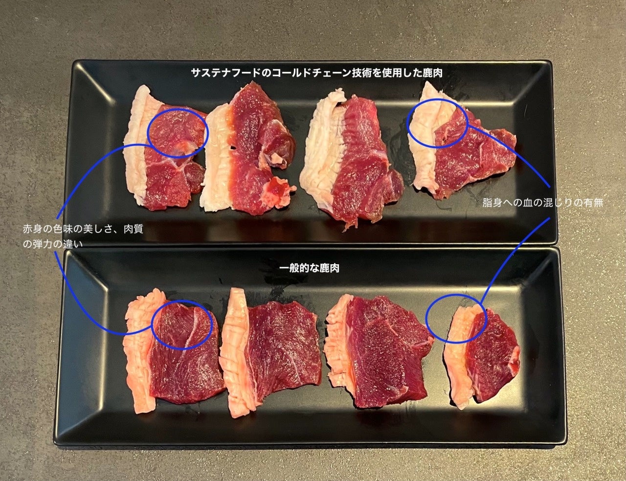 一般的な鹿肉と比較すると、血の混ざりがないため、通常の鹿肉よりも臭みが少なく、弾力のある新鮮な鹿肉の状態を維持し流通することで、多くのみなさまにこれまでに味わったことのない本当の鹿肉の味わいを提供します。本プロジェクトでは、日本各地で未活用・未流通の食材の調達から調理まで一気通貫で担うこのサステナフード事業を通して、日本全国にある社会問題を解決へと導く一歩を繋ぎ、ジビエ肉を美味しく、健康的な食事へとアップサイクルさせていくとともに、循環型の新たな食のしくみを生み出して参ります。
