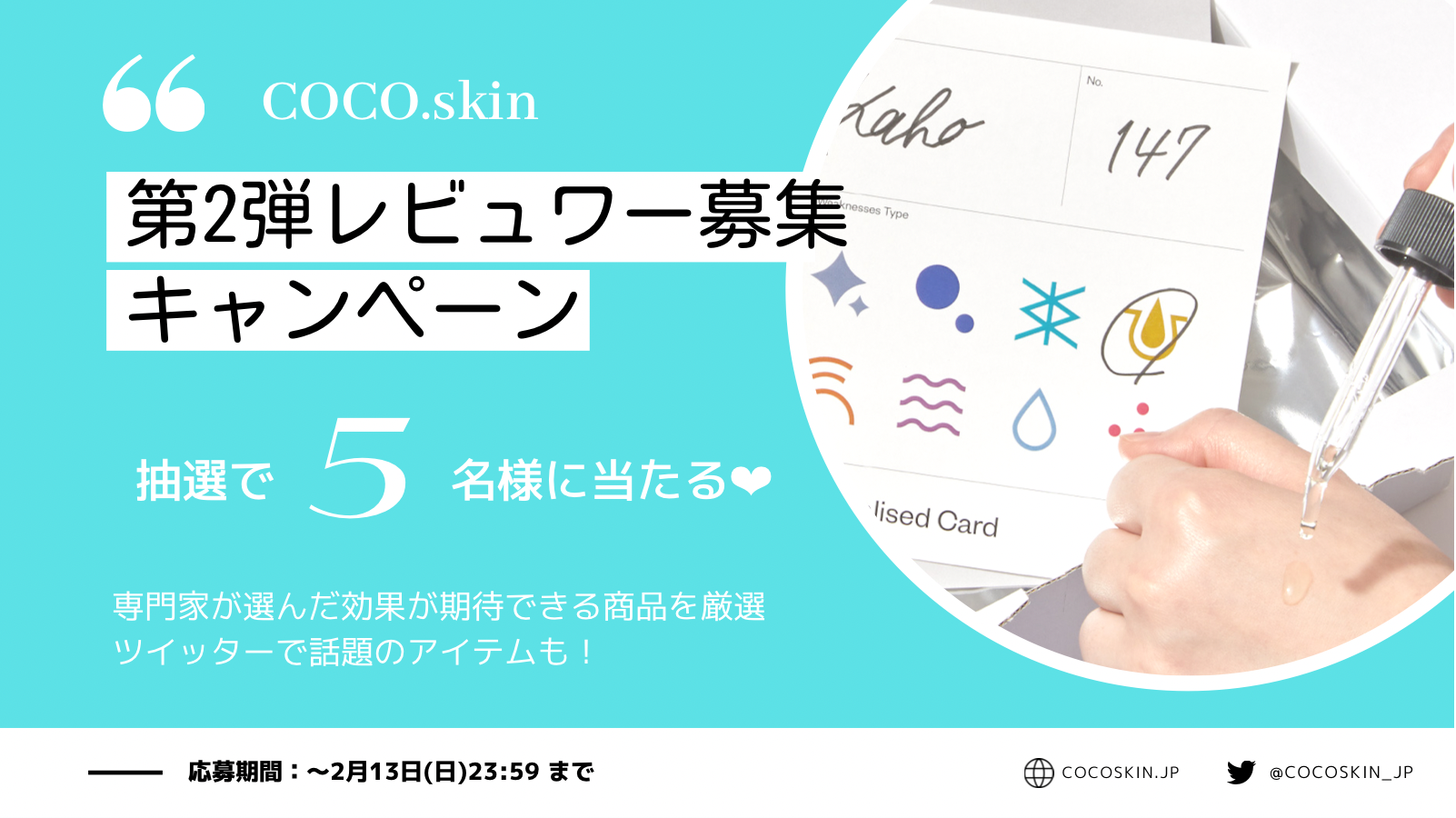 効果性のある商品の中から一人一人の肌悩みに働きかける商品を提案するECサイト『COCO.skin(ココスキン)』を運営するSkin Code,inc.(本社:東京都江東区、代表取締役:三輪みゆき)は、ご好評につき、Twitterにて開催した「レビュワー募集キャンペーン」第2弾を2022年2月1日~2月13日で開催いたします。