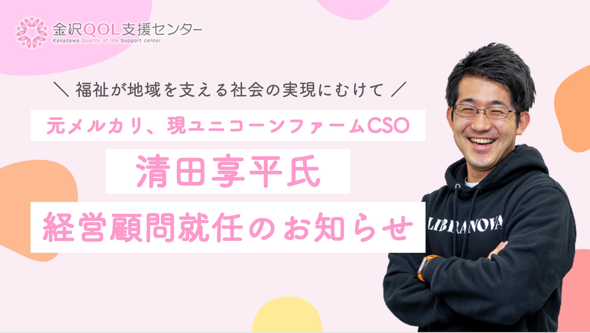 「福祉が地域を支える社会の実現」をミッションに掲げ、障害者就労支援サービス・在宅医療サービスを展開している、金沢QOL支援センター株式会社(本社:石川県金沢市、代表取締役:岩下琢也)は、メルカリにてグローバルHRとして組織成長に貢献し、これまでスタートアップ含め様々な企業で経営戦略や資金調達、組織マネジメント等を担ってきた清田享平氏が2022年9月に経営顧問に就任したことをお知らせいたします。
