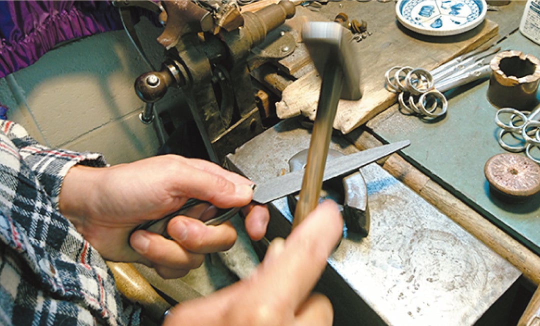 はさみを作る上で、とても大切な作業、 はさみに「ひねり」と「ため」をカナヅチ等でたたいて作ります。