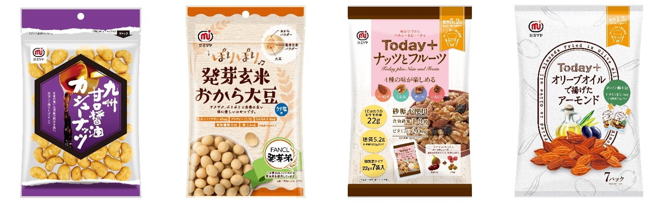 公式オンラインショップでは、おつまみやおやつとして楽しめるナッツの他、地域限定でこれまで手に入れるのが難しかった「九州甘口醤油カシューナッツ」やギルトフリーなおやつとして楽しめるファンケル発芽玄米を使用した「ぽりぽり発芽玄米おから大豆」、1回分が個装された+todayシリーズから「ナッツとフルーツ」や「オリーブオイルで揚げたアーモンド」などラインナップ豊かな品揃えの商品を販売いたします。今後もミツヤ厳選の商品を順次追加してまいります。