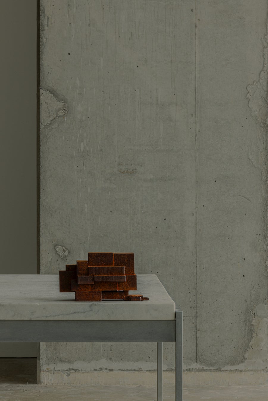 アントニー•ゴームリー は、ブロンズによる身体表現で有名なイギ リスの彫刻家である。作家自身の身体を彫刻化することで、身体と空間の 複雑な関係性や、外的な身体と内的な心の繋がりを探求する。2009 年に開 始した《MEME ( ミーム )》シリーズでは、33 体の異なる身体の姿勢を模して デザインされた小さなブロンズ彫刻を発表。生物学的な身体の形状を角張 ったブロックに変換し、人間の身体を「身体容器」という建築言語に置き 換えることで、彫刻を身体の住居という概念に結びつけ、彫刻と彫刻が置 かれる空間との関係を具現化させる。ブロック状の作品群は、全体像を見 渡せるように小さく作られ、観る者に建築形態の彫刻と自身の身体との関係を考察させる。