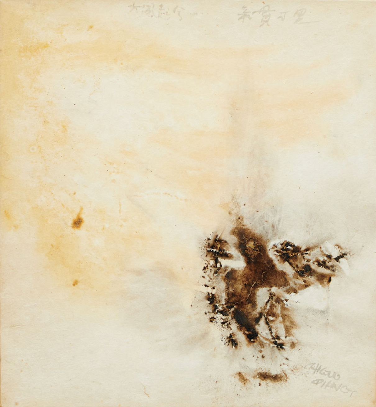 蔡は、1986 年から 95 年まで日本に滞在していた経験があり、代名詞とも言える「火薬」を用いた表現方法が定着したのは、この頃の経験が大きく、1991 年には P3 art and environment にて、ビッグバンを意味する「原初火球 : The Project for Projects」と題した展覧会を開催。1993 年には《龍脈/万里の長城を 1 万メートル延長するプロジェクト : Project for Extraterrestrials No.10》で万里の長城の最西端の関所、中国嘉峪関から 1 万メートルの炎と硝煙の長城を出現させた。 本作品《龍之二十九》は、日本滞在期である 1993 年に制作された初期の火薬ドローイング作品である。爆発が導き出す偶発的な成り行きへと着眼を置き、その中にある破壊と創造の両義的な関係性の中に美を見出す。この現在にも一貫する蔡の芸術的実践におけるその若き探究心は、燃えつきた火薬の跡とともに染みついている。