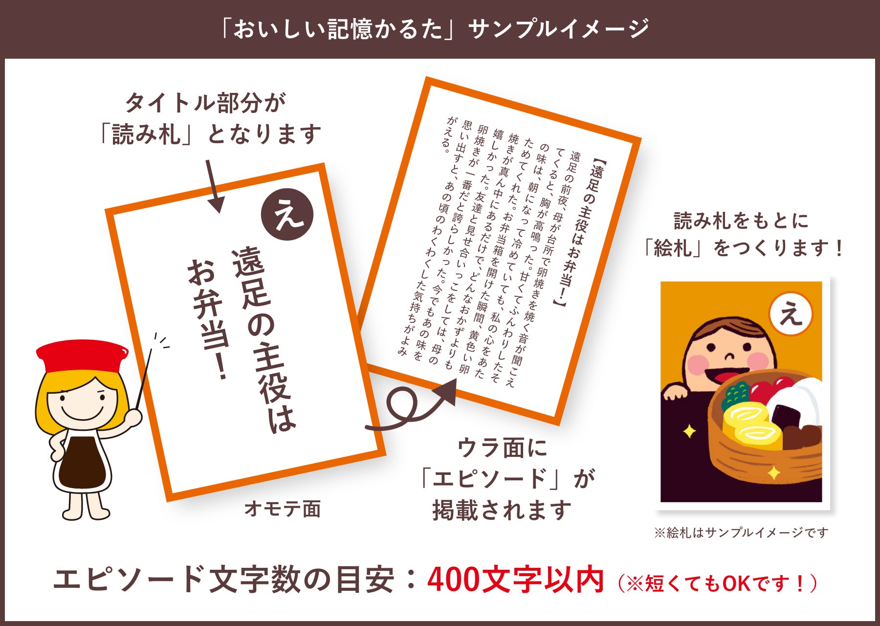 全国のみなさまから「おいしい記憶」を「かるた」の読み札として募集します(現在募集中〜2025年8月31日まで)。