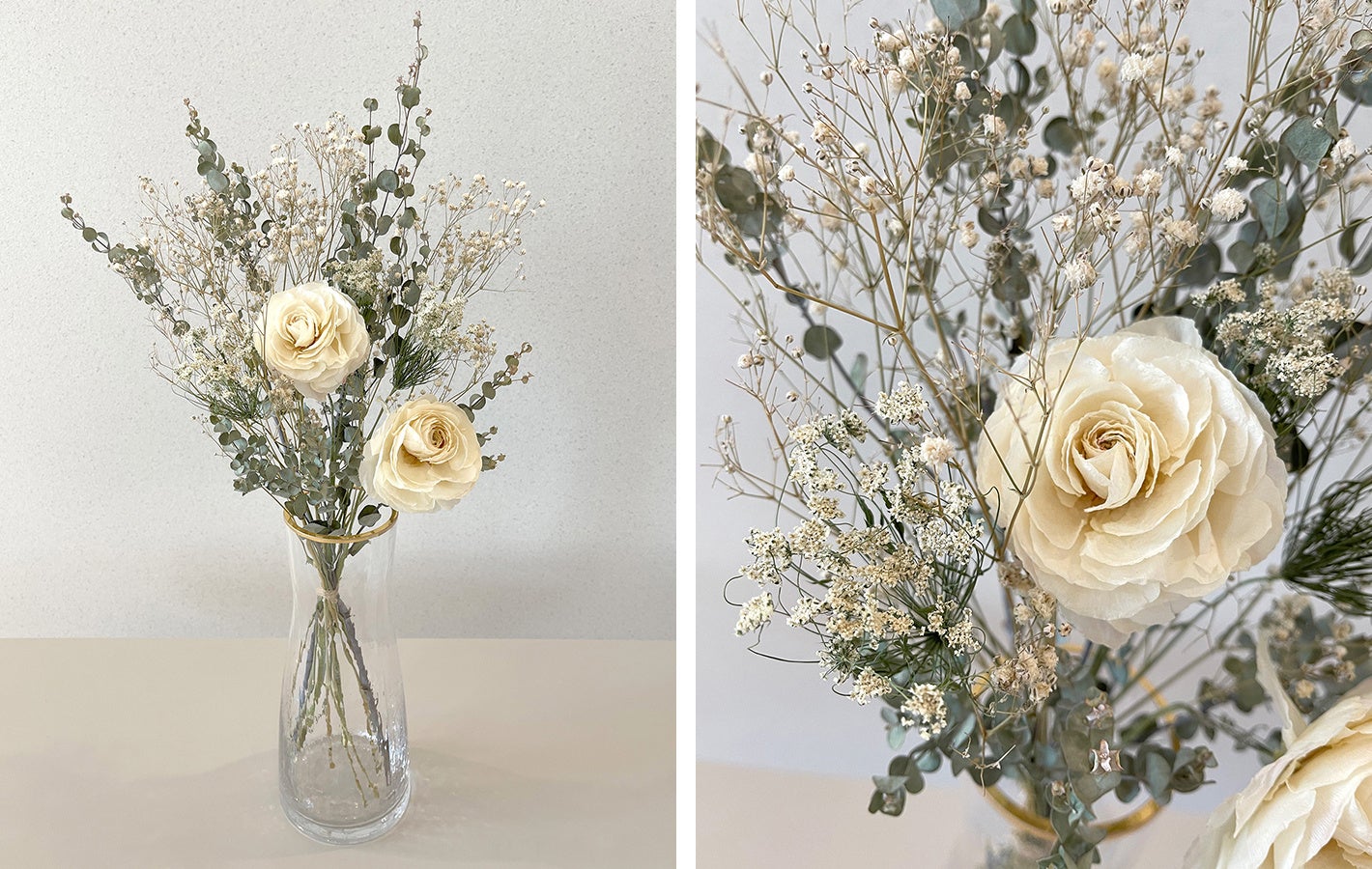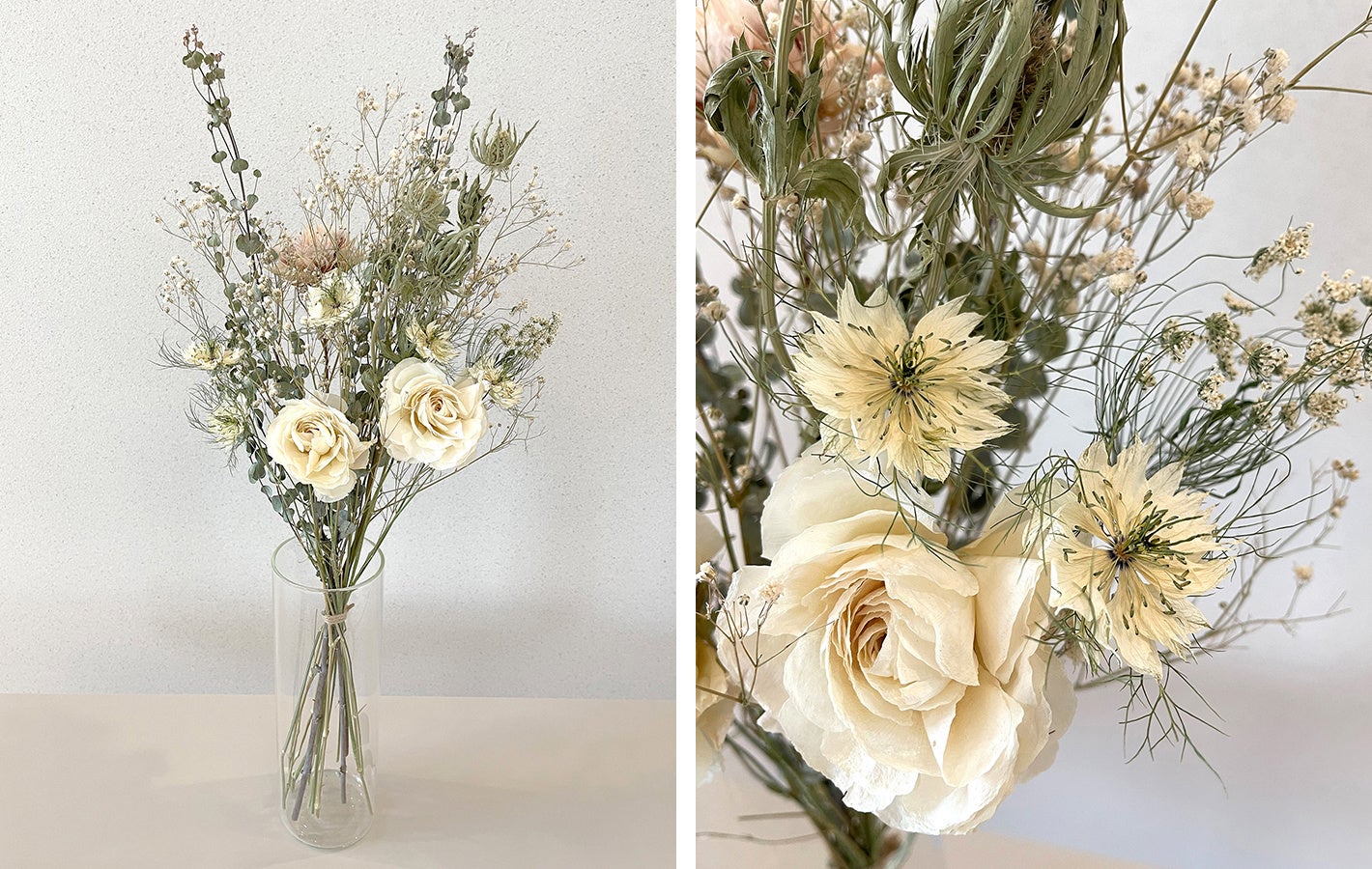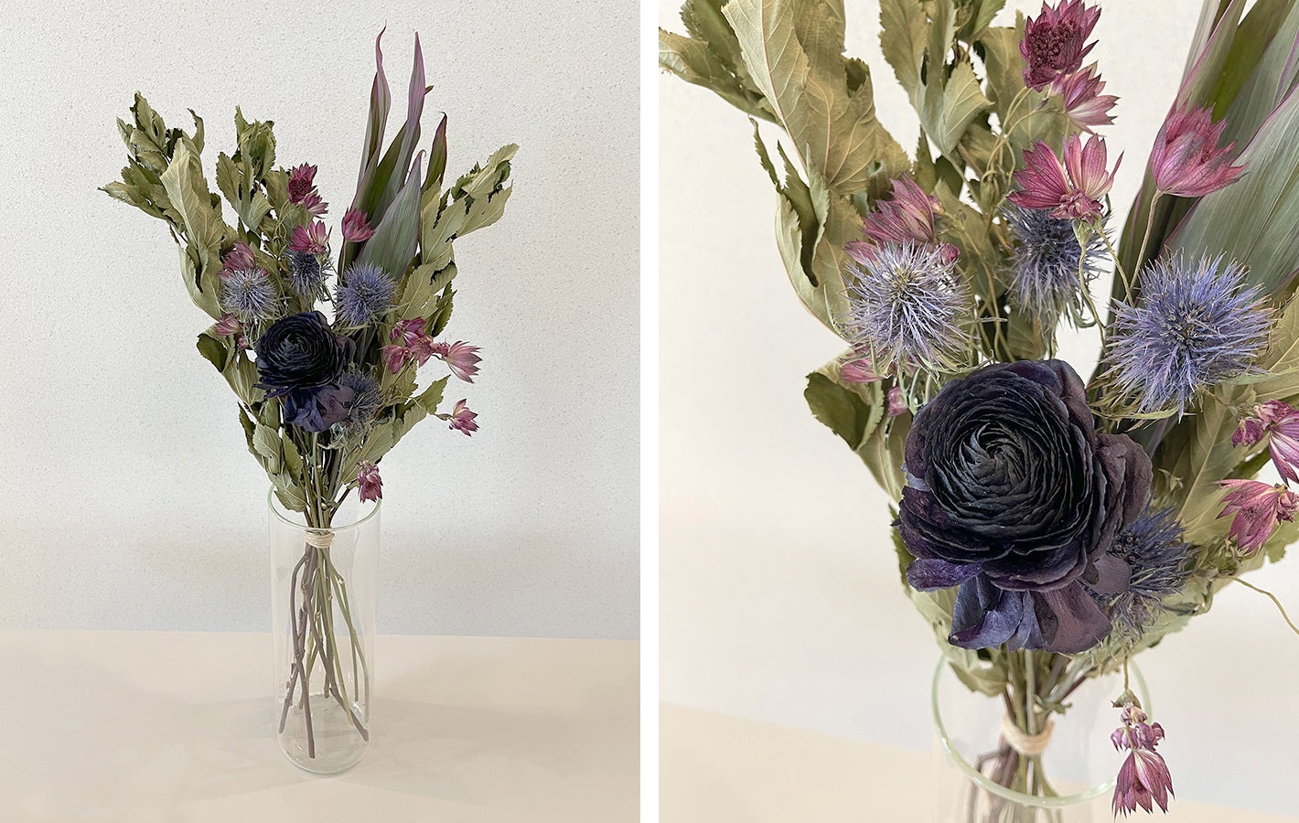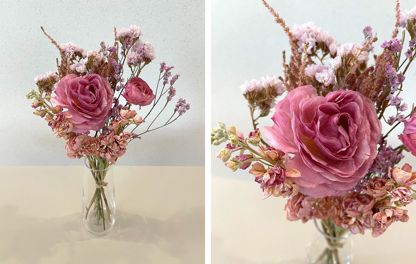 通常のドライフラワーのように花びらがぎゅっと固まらず、ふわっと風に揺れるぐらい軽やかな柔らかさが感じられます。