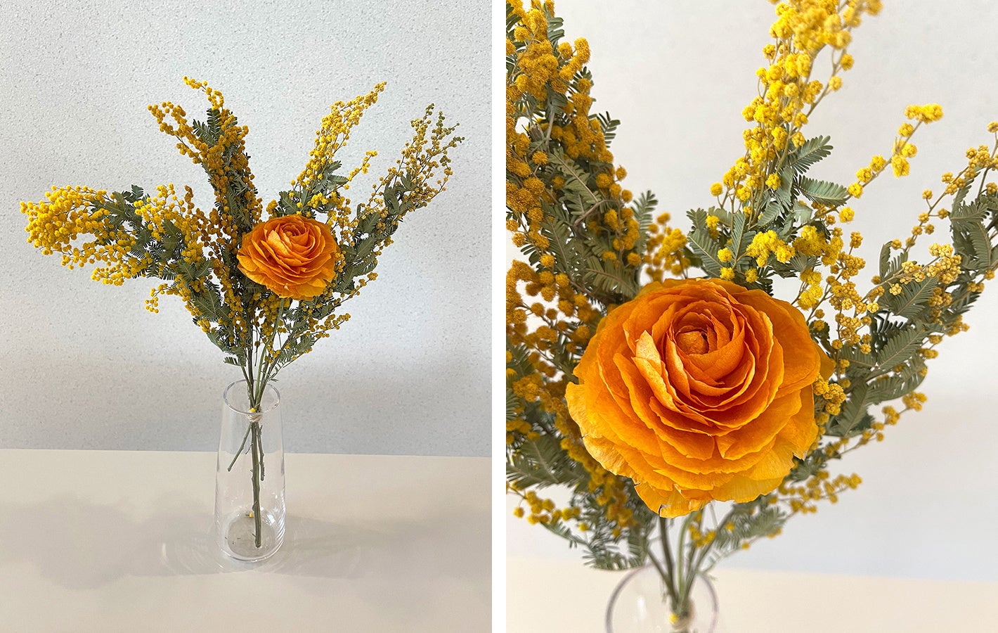 【予算800円】オレンジのラナンキュラスとミモザのブーケ