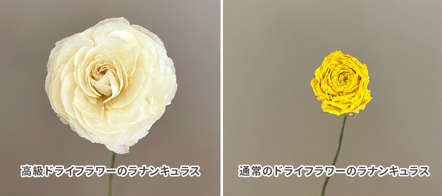 「ラナンキュラス」高級ドライフラワーは花が大きいため、高級ドライフラワー1本で通常ドライフラワー3本分ぐらいの面積を埋めることができます。
