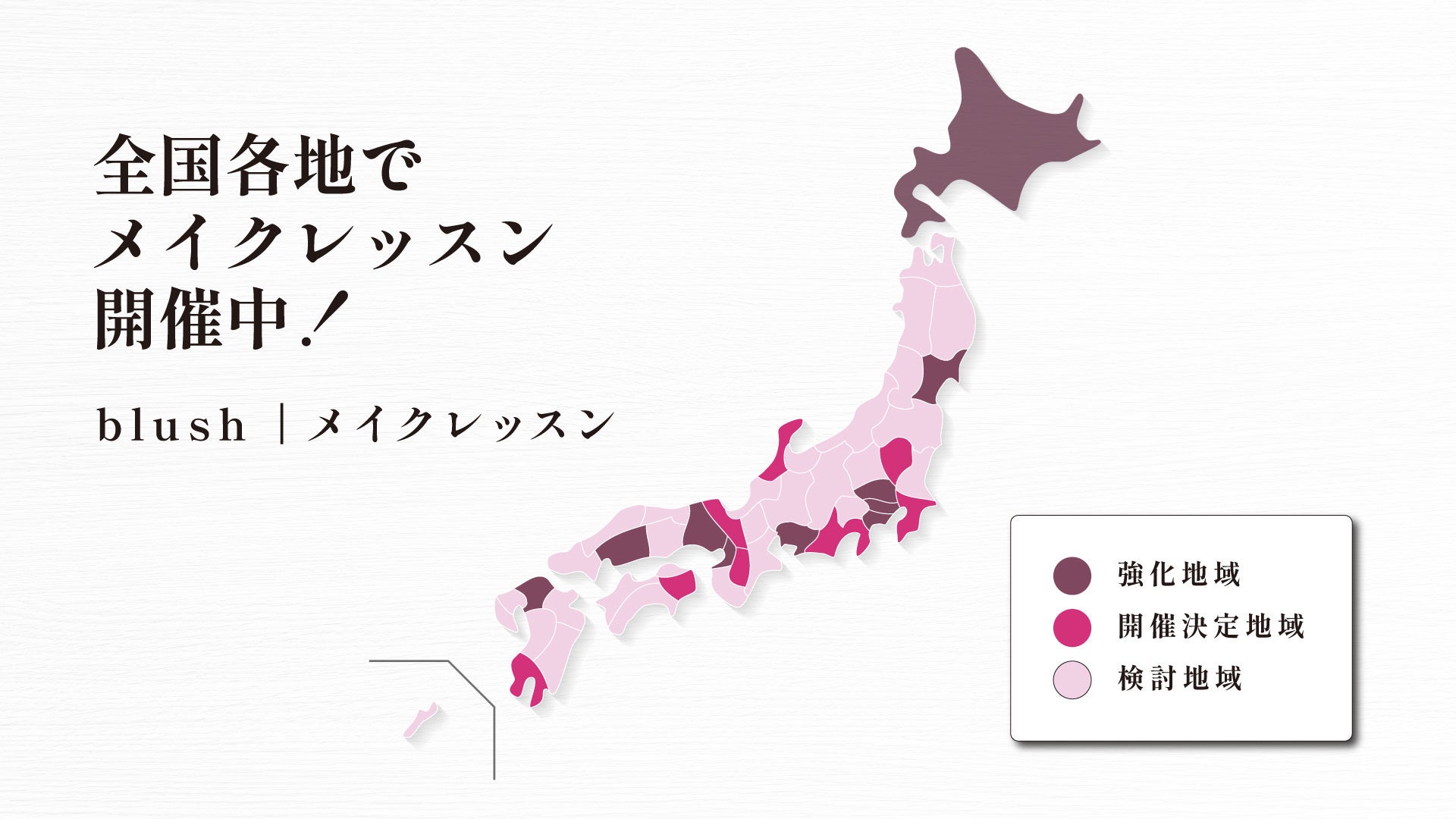 これまでは、関東圏(東京/神奈川)や関西圏(大阪)を始め、福岡/名古屋/仙台など全国の主要都市を中心としてきました。今後の開催方針としましては全国の47都道府県に範囲を広げて、毎週末開催していく予定です。メイクでお悩みのすべての方に対し、"自分らしく輝けるよう"なサポートを提供できるよう努めていきます。
