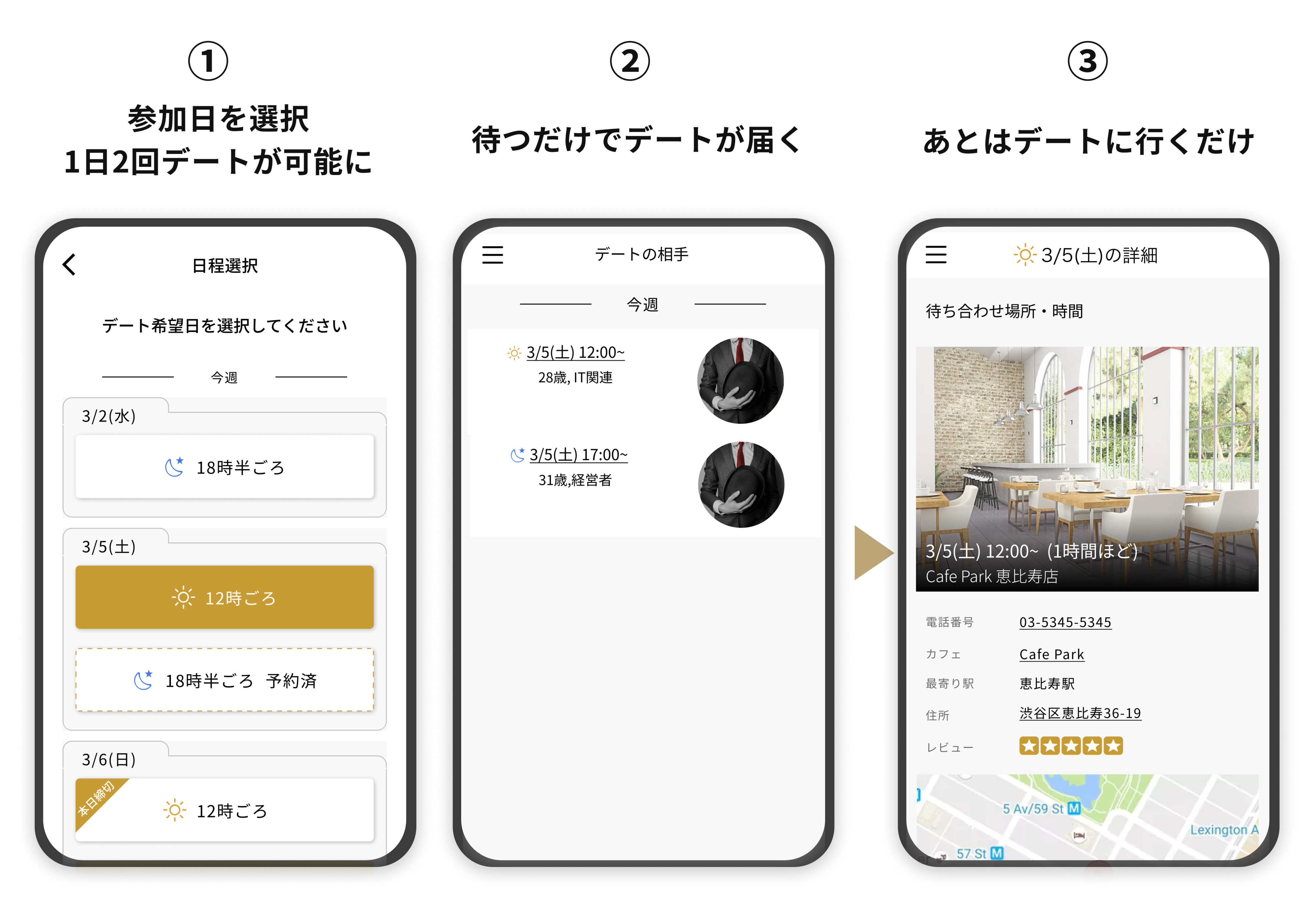 従来の夕方デート(16:00〜17:30)に加え、土日は昼デート(11:30〜13:00)が選択可能になります。そのため、最大で週に5回(※2)(水曜夜、土曜昼、土曜夕方、日曜昼、日曜夕方)の参加ができます。デート日程を予約する際にご希望のデート枠を選択するだけで自動でデートがセッティングされます。