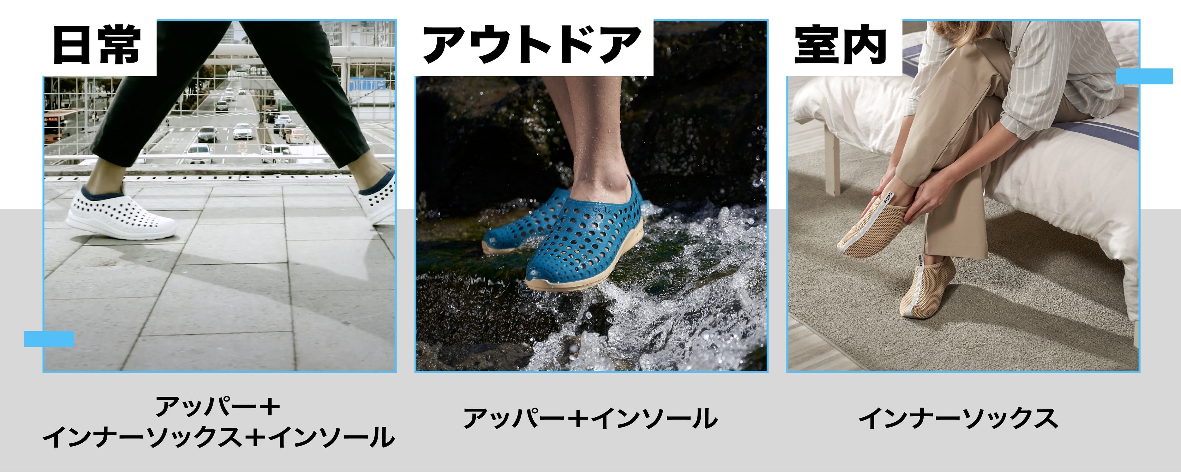 「アッパー」「インナーソックス」「インソール」を自由に組み合わせることで、3通りの履き方が可能。日常使いでは『GreenPlax® Fish』だけで、靴下は要らずで快適に出かけられます。途中雨が降ってしまった場合も「インナーソックス」を脱いで履くだけでしっかりと雨に対応!週末にキャンプや海遊びに行く際は親水性の高い「アッパー」と「インソール」がオススメ。濡れを気にすることなく、水遊びを快適に楽しむ事ができます。「インナーソックス」のみ履くと、室内用スリッパとして出張等でも活躍!旅行やウォーターアクティビティは水陸両用で履ける『GreenPlax® Fish』一足で解決!