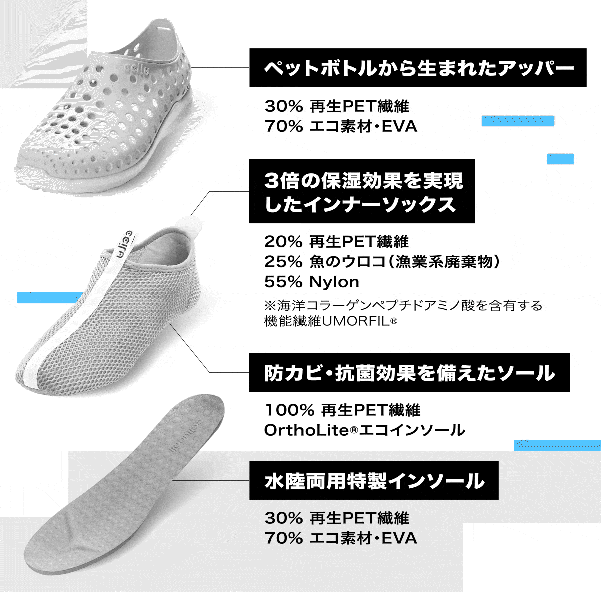 同ブランドにて50万足を売り上げた第一弾のウォーターシューズより革新的な素材を使用し、グレードアップしました。20gの魚のウロコから抽出したコラーゲンと10本のペットボトルによって作られた『GreenPlax® Fish』。海洋の廃棄物をアッパーからソールまで丸ごと、シューズにしました。