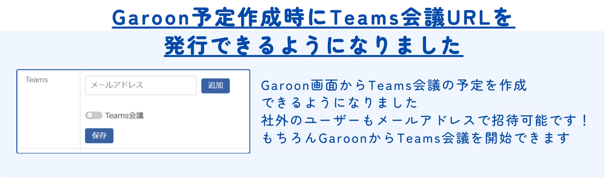 GaroonからTeams会議URLを発行し、メールアドレスで参加者を招待することができます。Garoonからの一括管理で、会議の手配が簡素化され、生産性が向上します。