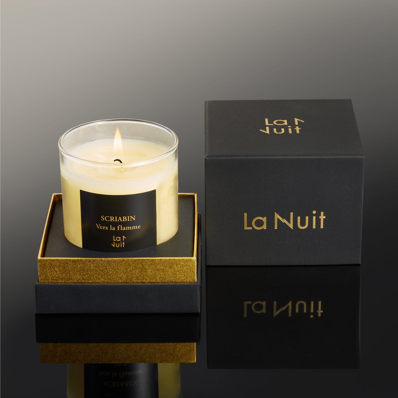 香りの題材は、スクリャービンの独創性が最も表現されている後期のピアノ曲をセレクト。『ピアノソナタ7番“白ミサ”』、『9番“黒ミサ”』、『10番“昆虫”』を香水に、『詩曲 炎へ向かって』をアロマキャンドル&ディフューザーにしました。