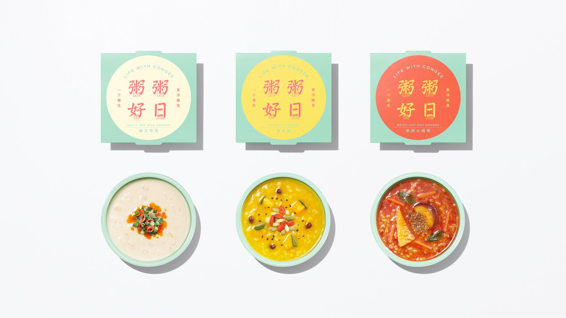 商品名:「粥粥好日(カユカユコウジツ)」写真左から<鹹豆漿粥(シェントウジャンガユ)><南瓜粥(カボチャガユ)><麻辣火鍋粥(マーラーヒナベガユ)>の3商品。
