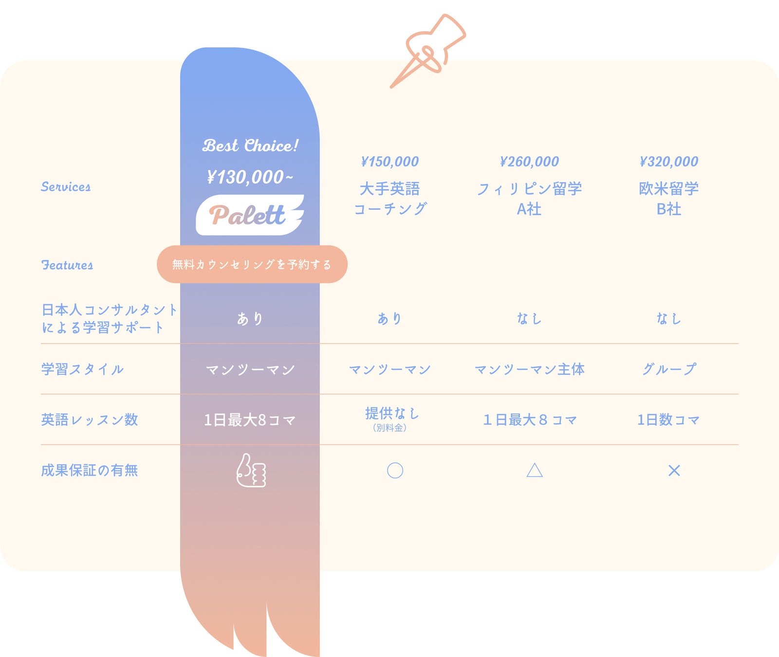 Palettは、質の高い英語教育をリーズナブルに提供し、短期間で英語力を身につけられることを目指しています。欧米留学と比較しても圧倒的にコストパフォーマンスが良く、従来の英語コーチングサービスよりも確実に高い成果が出せる学習プランを用意しています。