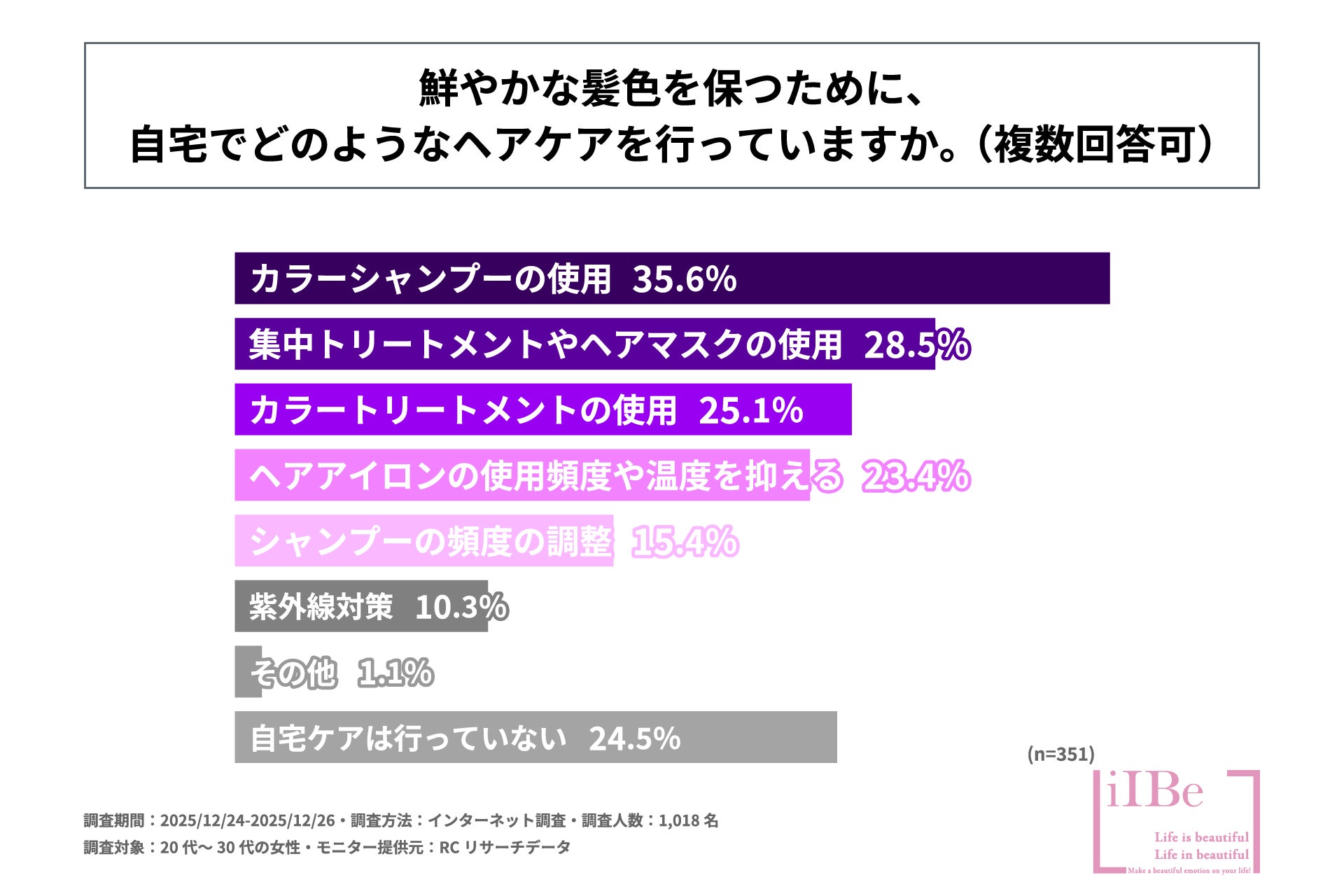 調査の最後、派手髪にしたことがある20代~30代の女性を対象に「鮮やかな髪色を保つために、自宅でどのようなヘアケアを行っているか」を尋ねる設問への回答では、1位が「カラーシャンプーの使用」で35.6%、2位が「集中トリートメントやヘアマスクの使用」で28.5%、3位が「カラートリートメントの使用」で25.1%という結果になりました。この結果から、鮮やかな髪色を保つための自宅での主なヘアケアは「カラーシャンプー」や「カラートリートメント」といった色素を補うケアと「集中トリートメントやヘアマスク」によるダメージケアであることが判明しました。