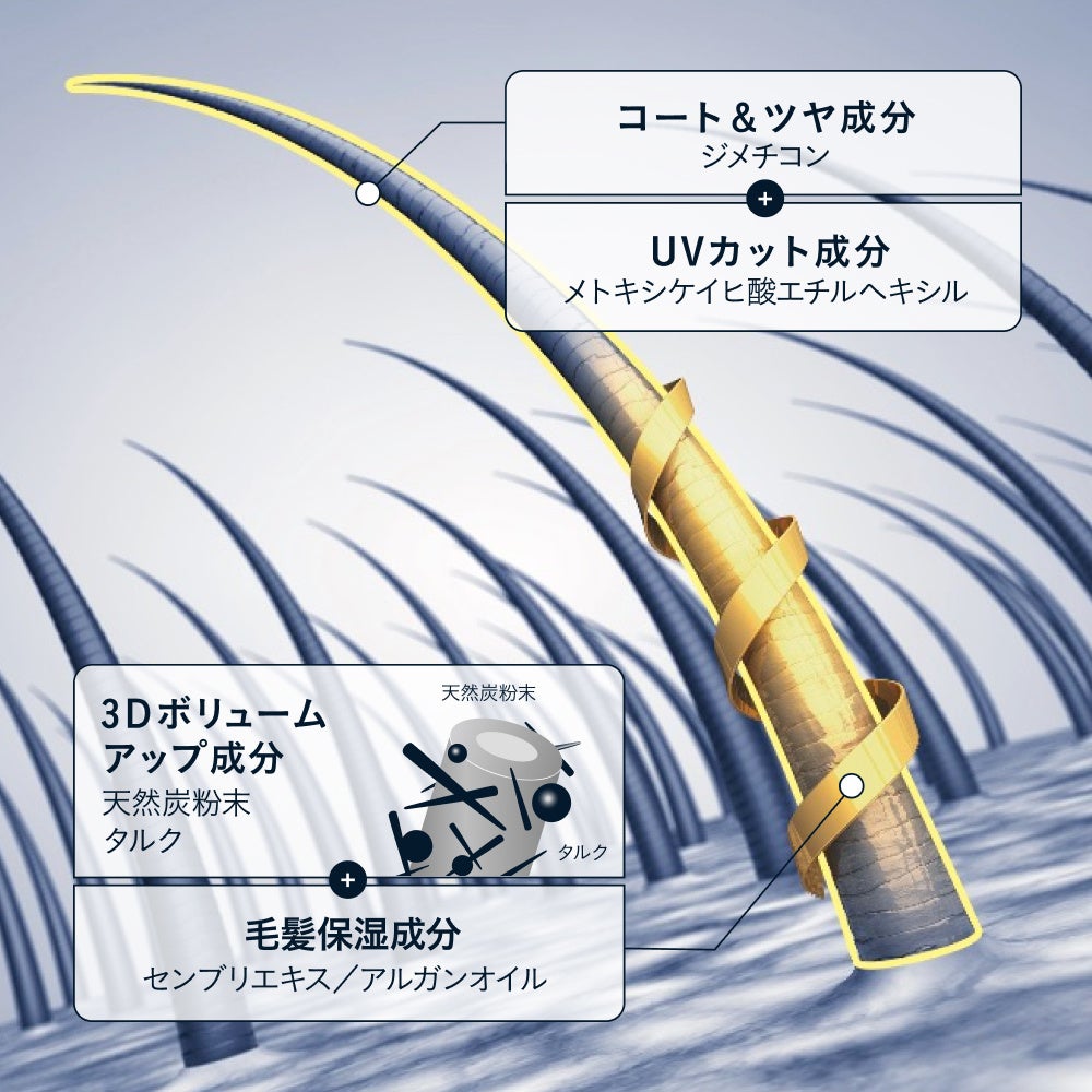 3Dボリュームアップ成分配合。 ミクロの天然微粒子が髪に付着し、自毛のうぶ毛や細毛1本1本に絡みついて太らせてボリュームアップ! ツヤのある自然なヘアスタイルを演出します。