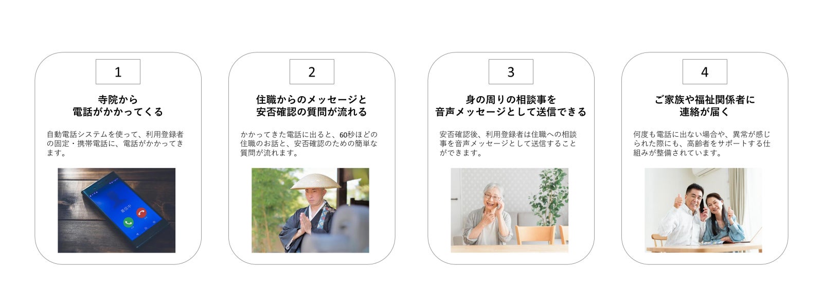 「おてらコール」は、NTT東日本が提供する「シン・オートコール」を活用した、1人暮らしの高齢者を見守るサービスです。また、「シン・オートコール」とはAI・クラウド技術で録音した肉声などを固定・携帯電話へ一斉に情報伝達することができるシステムのこと。(※1)寺院は自動電話システムを使って、一人で暮らす高齢者の固定・携帯電話に、事前に録音した60秒ほどの法話と安否確認のための簡単な質問を組み合わせた電話を発信。電話を受けた高齢者は、身の周りの相談事を登録することもできます。また異常を察知した場合には、寺院が、ご家族や地域の社会福祉関係者に連絡し、連携をとりながら対応いたします。
