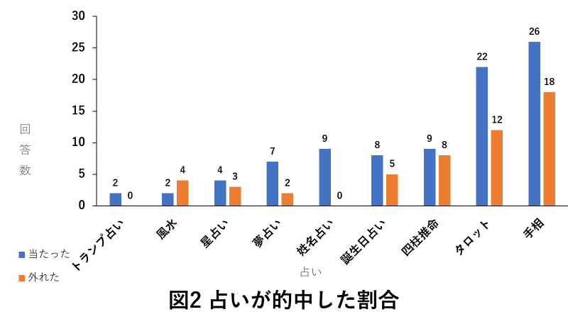 結果、「風水」のみ当たったという回答よりも外れたという回答の方が多くあげられていました。その他の占いについては、いずれも当たったという回答の方が多い結果に。