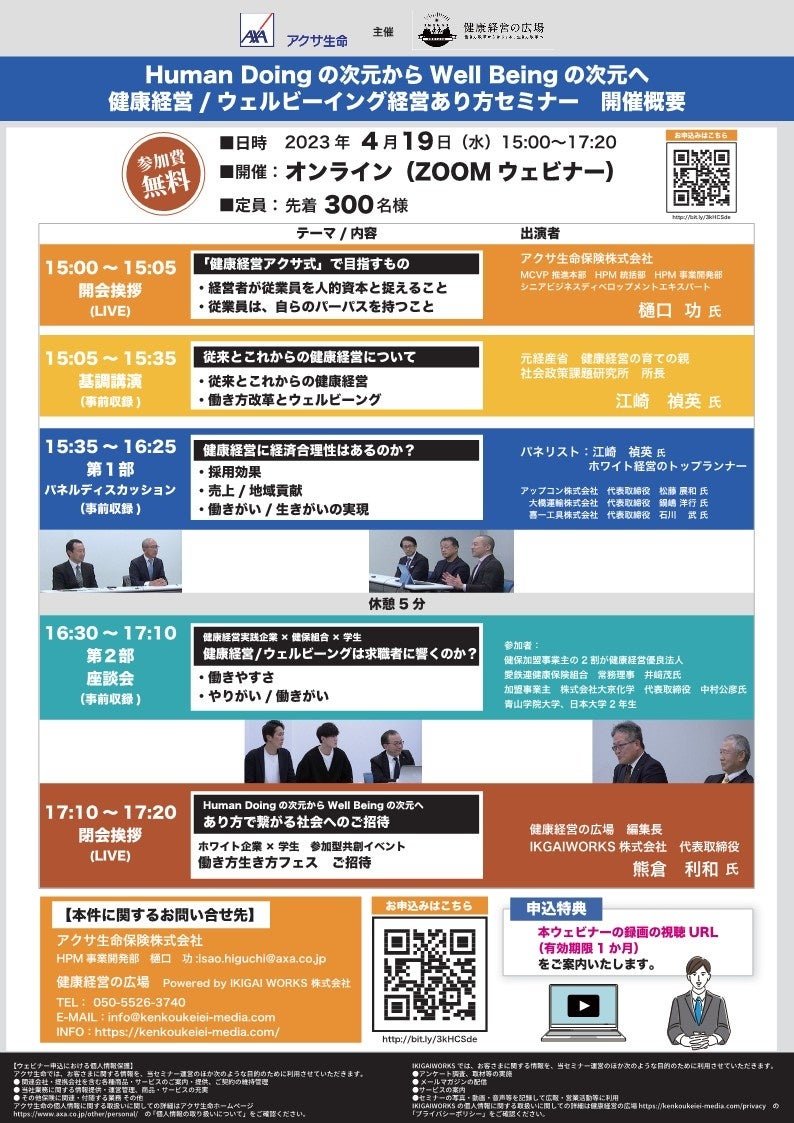3月9日、’23年の健康経営優良法人認定の結果が経済産業省から発表され、大企業部門2,666社(前年比+377社)、中小企業部門14,012社(前年比+1,757社)ともに昨年度を超える企業が認定されました。今回で7回目となり着実にすそ野が広がっている健康経営ですが、昨今は、健康管理からワークエンゲージメントの実現、さらにはウェルビーングや人的資本経営の土台という位置づけに健康経営が深化しています。IKIGAI WORKS株式会社(本社:山梨県北杜市)と、アクサ生命保険株式会社(本社:東京都港区)は、人事部門/経営者に対して、健康経営の育ての親である江崎祥英氏(社会政策課題研究所所長,元経産省)などをお招きしーHumanDoingからWell-Beingの次元へー『健康経営,ウェルビーング経営のあり方セミナー』をオンライン開催します。